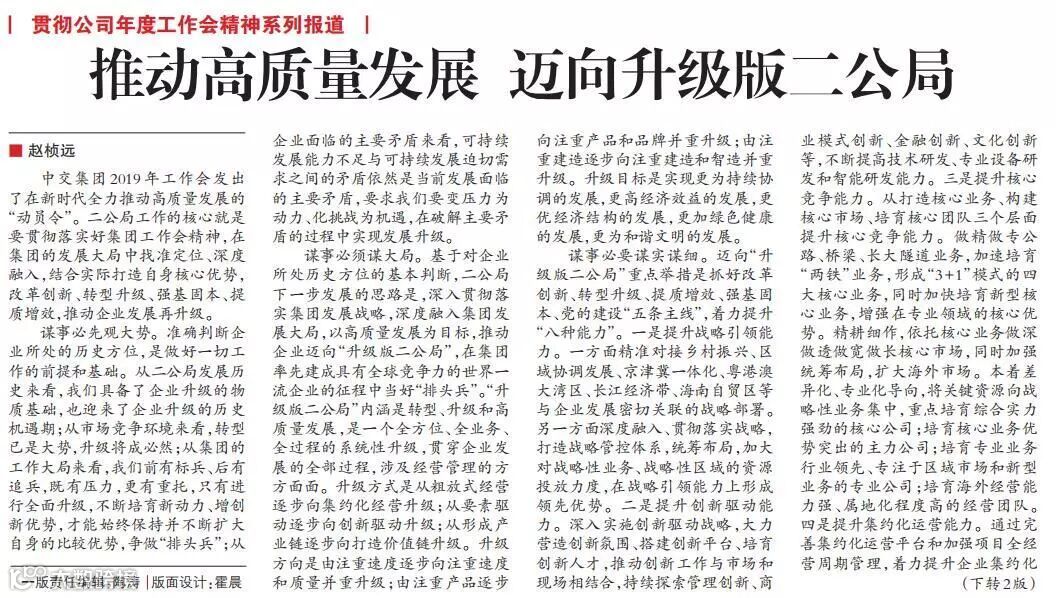 近日,中交集团《交通建设报》头版刊登局董事长、党委书记赵桢远署名文章《推动高质量发展,迈向升级版二公局》,现将全文分享如下。