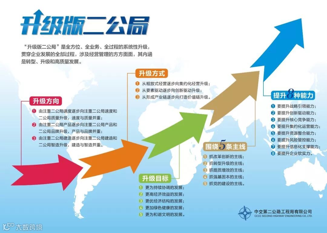 “升级版二公局”内涵是转型、升级和高质量发展,是一个全方位、全业务、全过程的系统性升级,贯穿企业发展的全部过程,涉及经营管理的方方面面。升级方式是从粗放式经营逐步向集约化经营升级;从要素驱动逐步向创新驱动升级;从形成产业链逐步向打造价值链升级。升级方向是由注重二公局速度逐步向注重二公局速度和二公局质量升级,速度与质量并重;由注重二公局产品逐步向注重二公局产品和二公局品牌升级,产品与品牌并重;由注重二公局建造逐步向注重二公局建造和二公局智造升级,建造与智造并重。升级目标是实现更为持续协调的发展,更高经济效益的发展,更优经济结构的发展,更加绿色健康的发展,更为和谐文明的发展。