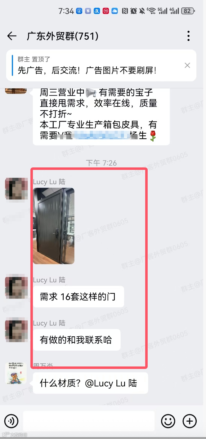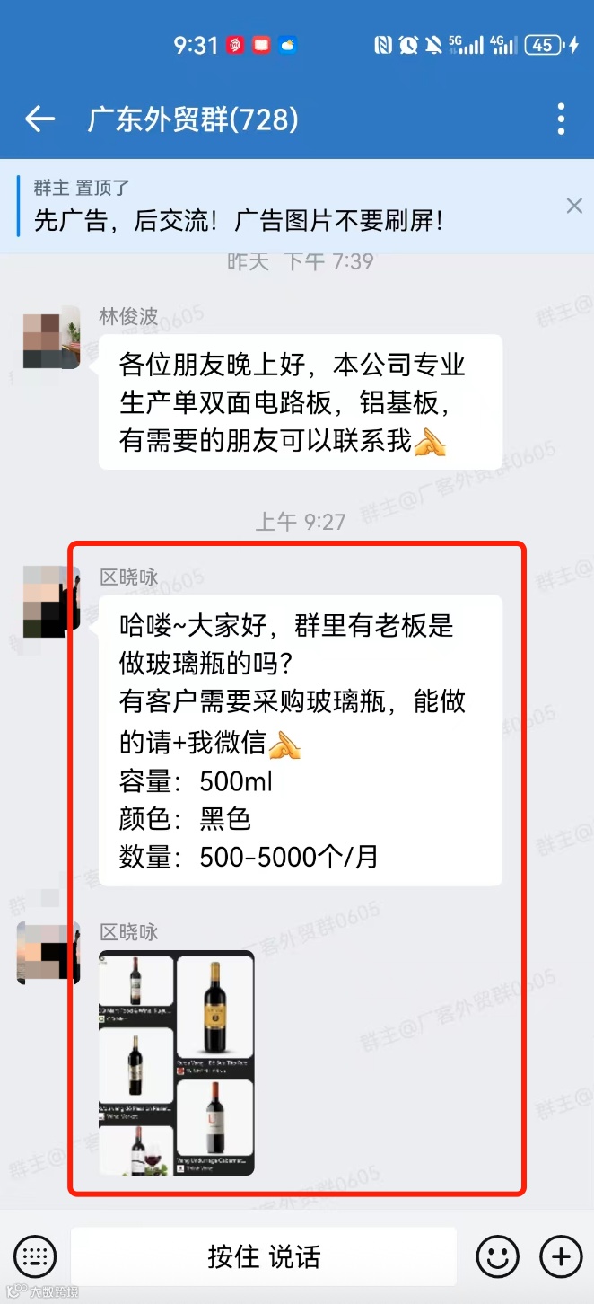 群内可发布外贸采购、产品销售信息(文字、图片、视频均可),请合理控制广告频率,禁止刷屏。