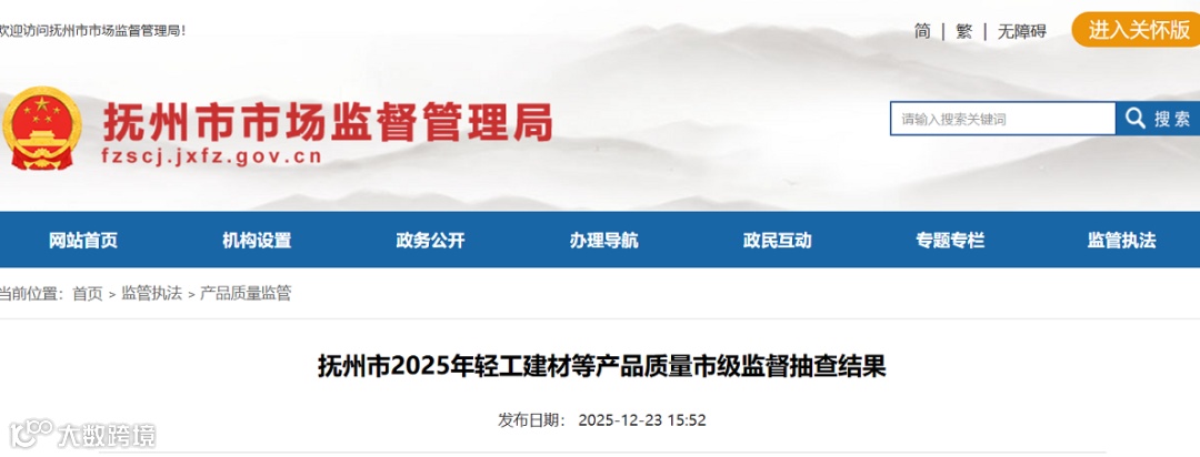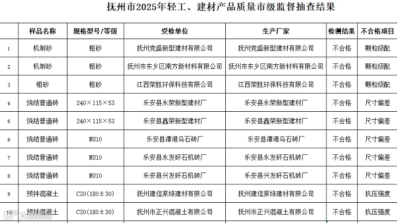 日前,抚州市市场监督管理局发布《抚州市2025年轻工建材等产品质量市级监督抽查结果》。