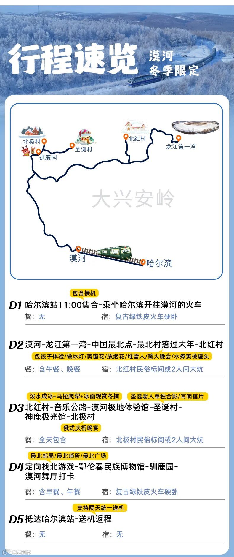 北红村-泼水成冰-马拉爬犁-冰面冬捕表演-音乐公路-(100km,车程约2h)漠河极地体验馆-圣诞村圣诞老人合影/明信片-神鹿极光馆-俄餐庆祝晚宴-北极村