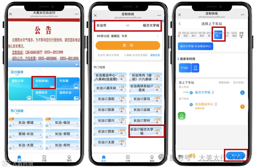 1.点击公众号下方【汽车客票】进入购票页面,点击“出行服务”中的【定制快线】模块,输入出发和到达地,选择出行日期、要乘坐的班次时间