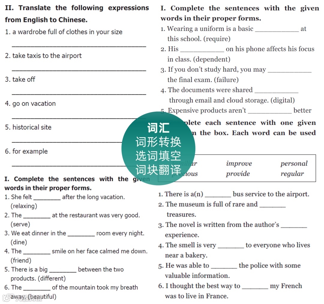 这次的初中基础版除了完形填空、选词填空外,还特别加入了针对可能变化的新风向题型设计的题目,如语篇语法填空、对话填空+短文填空。