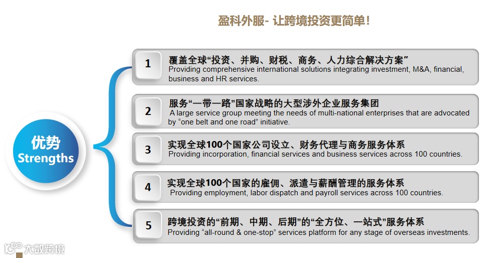 盈科外服,依托盈科全球体系的优质资源和广阔平台,为中国企业赴海外投资提供“投资咨询、调研评估、市场准入、公司设立、资金出境、投资架构、全球派遣、薪酬外包、跨境财税、离岸操作”等全方位、一站式服务。