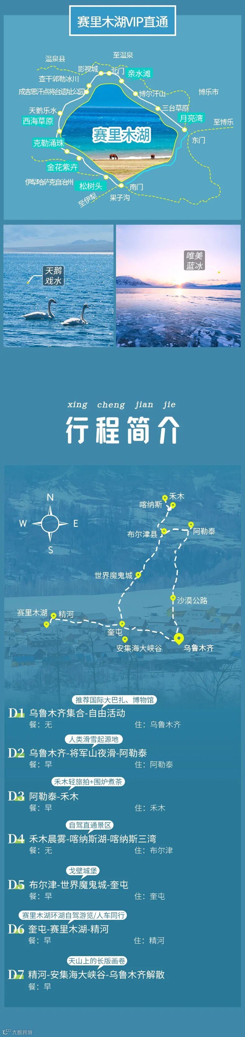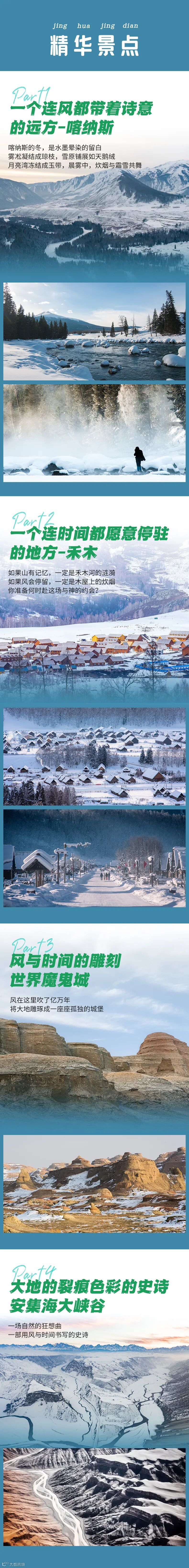 4、门票:将军山滑雪场夜滑(包含雪鞋、雪板、雪杖使用),乌尔禾魔鬼城门票+环保车,喀纳斯禾木冬季通票,赛里木湖自驾票;