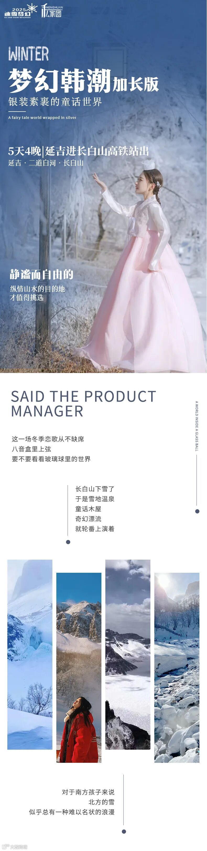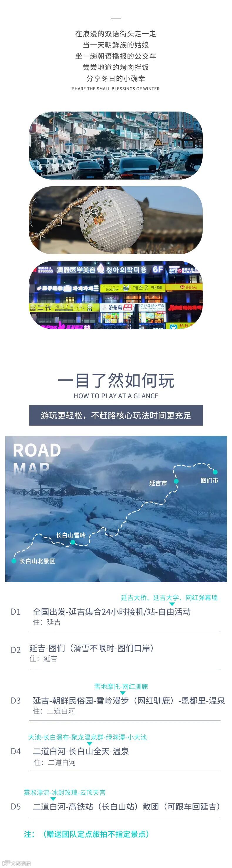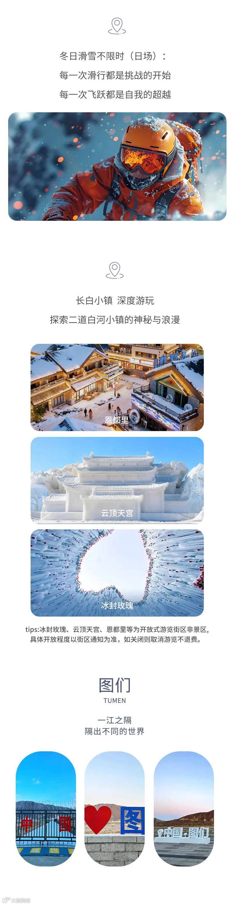 延吉-朝鲜民俗园-雪岭漫步(117KM,车程约2.5小时)-雪地摩托-网红驯鹿-二道白河(62KM,车程约1.5小时)-恩都里-温泉