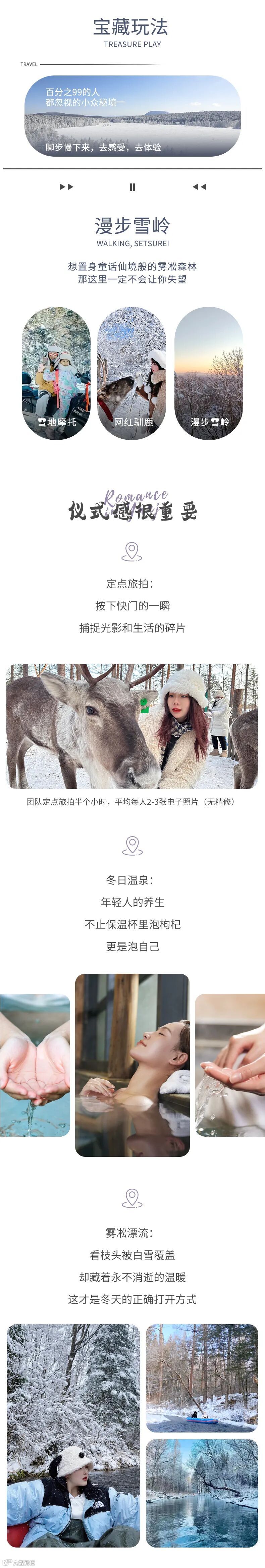 4、11月下旬之前,如遇气候原因雪量不够,无法运行雪地摩托,需要徒步进入景区观看驯鹿,或者取消雪岭行程,费用现退