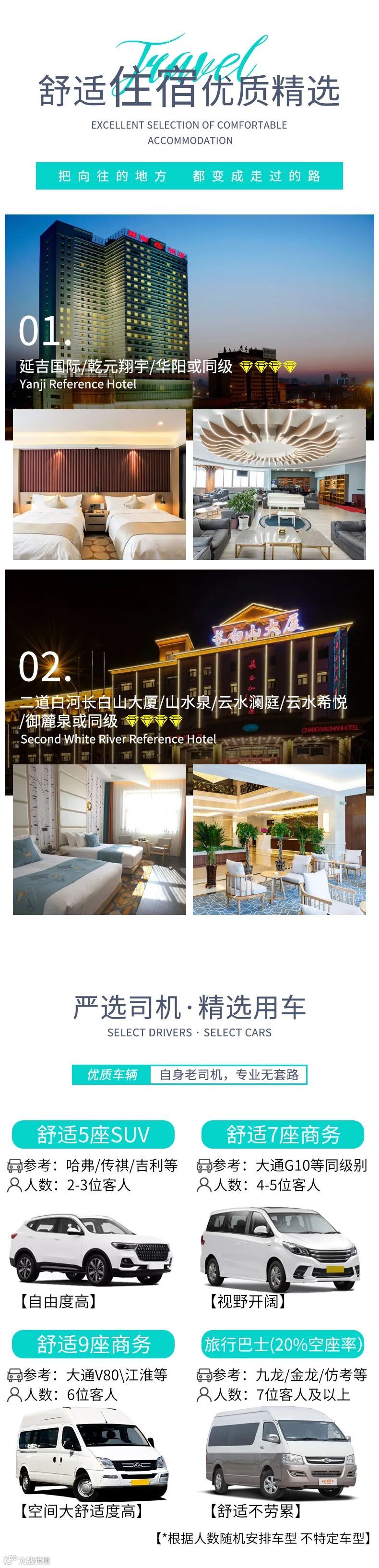 4、长白山景区由于最新政策需要预约,每天限流参观,团队参观时间严格按照预约场次进行;因此,景点参观顺序会按照预约时间进行调整或同团客人安排不同时间游览,敬请配合。如未能预约成功,无法安排游览,我们将调整行程前往游览“雪山飞湖”景区(退差价),望您谅解。
