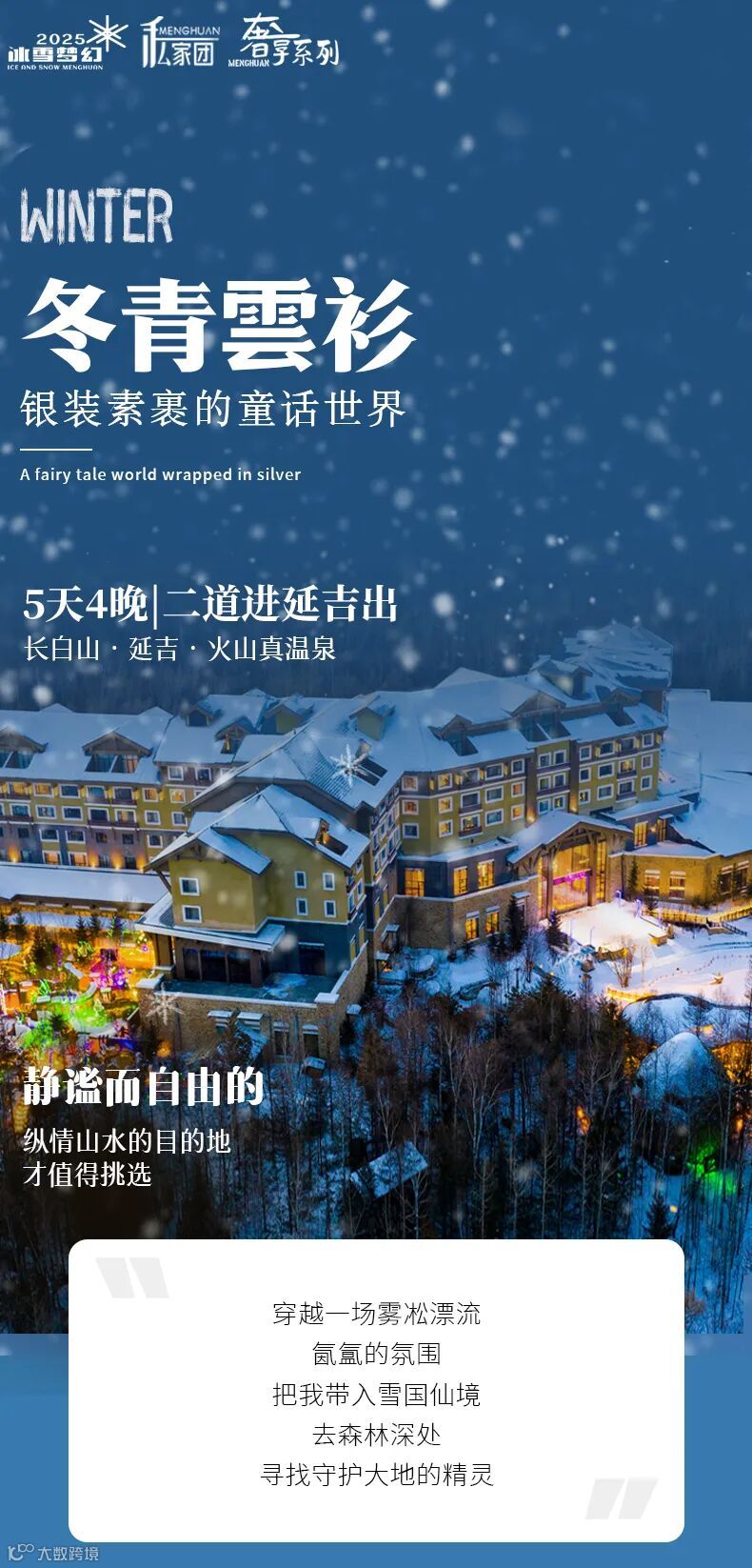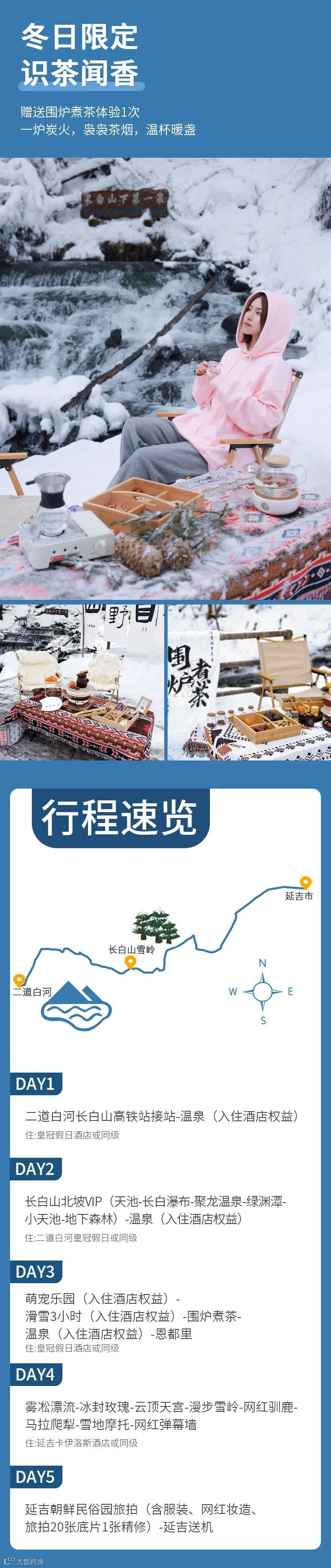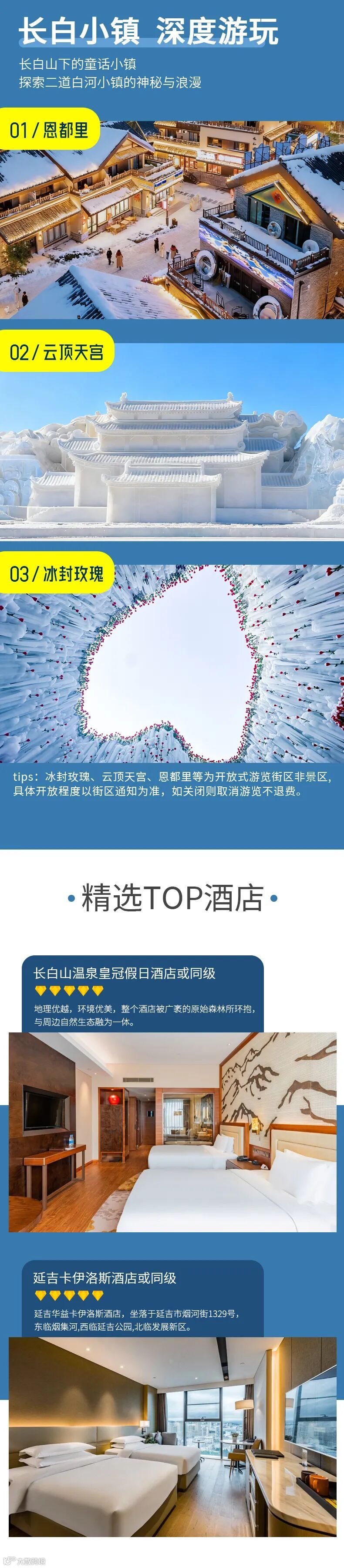 二道白河-雾凇漂流-冰封玫瑰-云顶天宫-雪岭漫步(62KM,车程约1.5小时)-雪地摩托-马拉爬犁-网红驯鹿-网红弹幕墙(120KM,车程约2小时)
