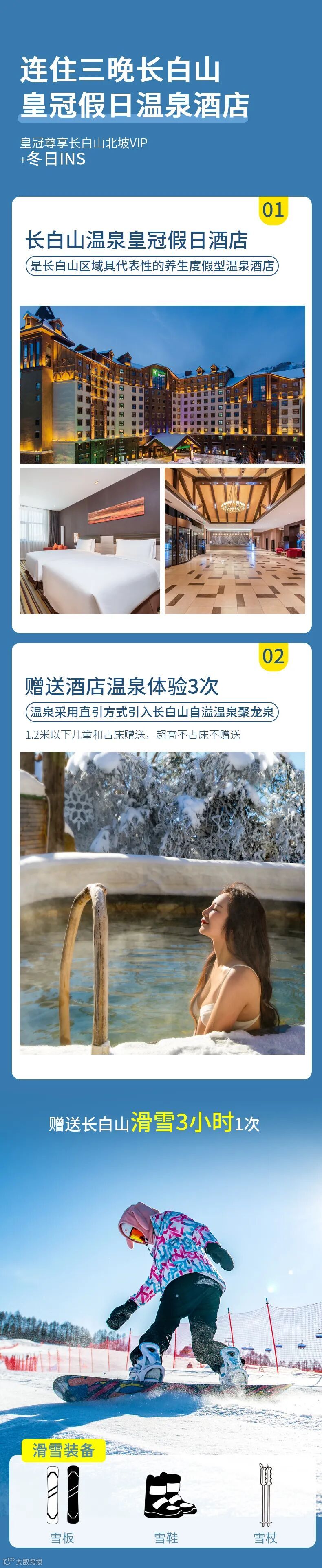 1、赠送长白山皇冠温泉体验3次;(1.2米以下儿童和占床赠送,超高不占床不赠送)。