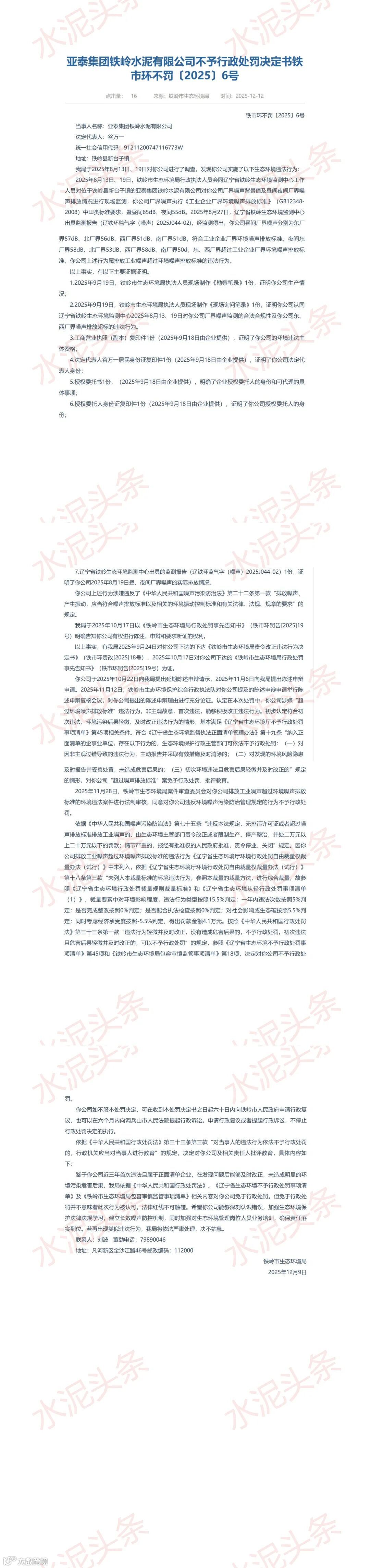 市生态环境局近期对亚泰集团铁岭水泥有限公司涉嫌噪声超标排放一案作出最终决定。根据该局出具的《不予行政处罚决定书》(铁市环不罚〔2025〕6号),涉事企业虽存在环境违法行为,但经综合审查,符合法定不予处罚情形,故依法免予经济处罚,代之以批评教育。