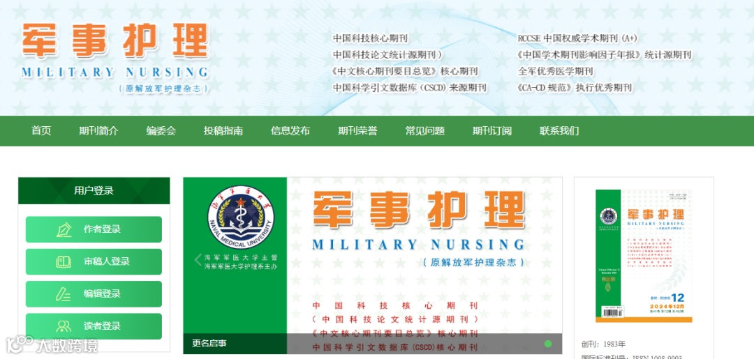 简介:全国性护理专业学术研究类期刊,是国家卫生部人事司认定的9种护理人员专业技术资格评审认定期刊之一。《军事护理》自1983年创刊以来,经过30多年坚持不懈的努力耕耘,期刊质量持续提升,学术影响力日益扩大,获评《中文核心期刊要目总览》核心期刊、国家统计源期刊、RCCSE中国权威学术期刊(A+)、中国科技核心期刊,被《中文核心期刊要目总览》、中国科学引文数据库(CSCD)、中国生物医学期刊文献数据库(CMCC)、中国生物医学期刊引文数据库(CMCI)等重要数据库收录,是国内目前仅有的三本同时被三大核心数据库收录的护理杂志之一,学科影响力指数排名Q1区,学术品质跻身于国内护理核心期刊前列。