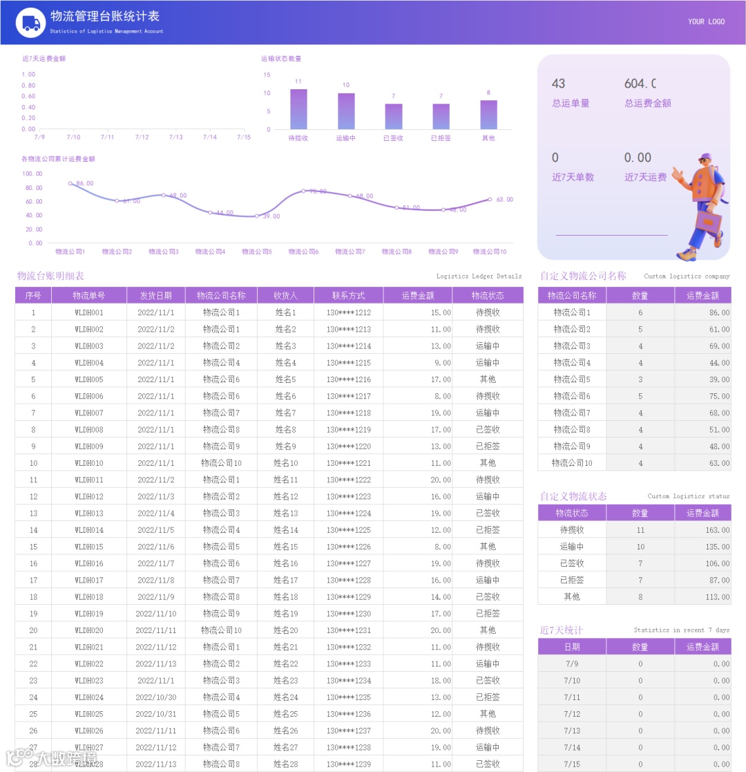 为此,我们整理了4套适用于物流企业使用的管理台账模板,涵盖日常运费结算、运费登记、丢件记录等核心场景。所有表格均内置函数公式,数据录入后可自动完成统计分析,1秒生成可视化图表,大幅提升工作效率。