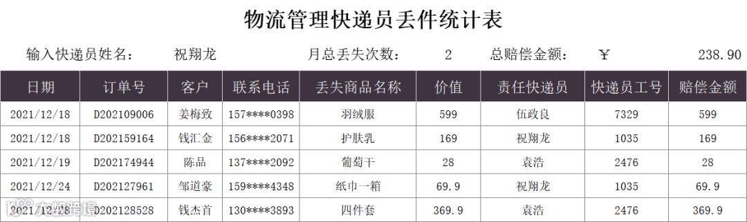 物流管理快递员丢件统计表