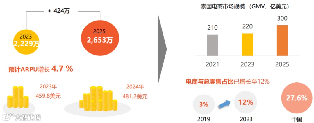 泰国电商用户数量及线上花费持续增加,推动电商市场规模持续扩大,年复合增长达22%。电商用户渗透率直至2025年将达46.0 %,用户数预计可持续增加到2,653万,同时2023年泰国电商市场规模220亿美元,预计2025年市场规模可达300亿,年均复合增长率 16%。