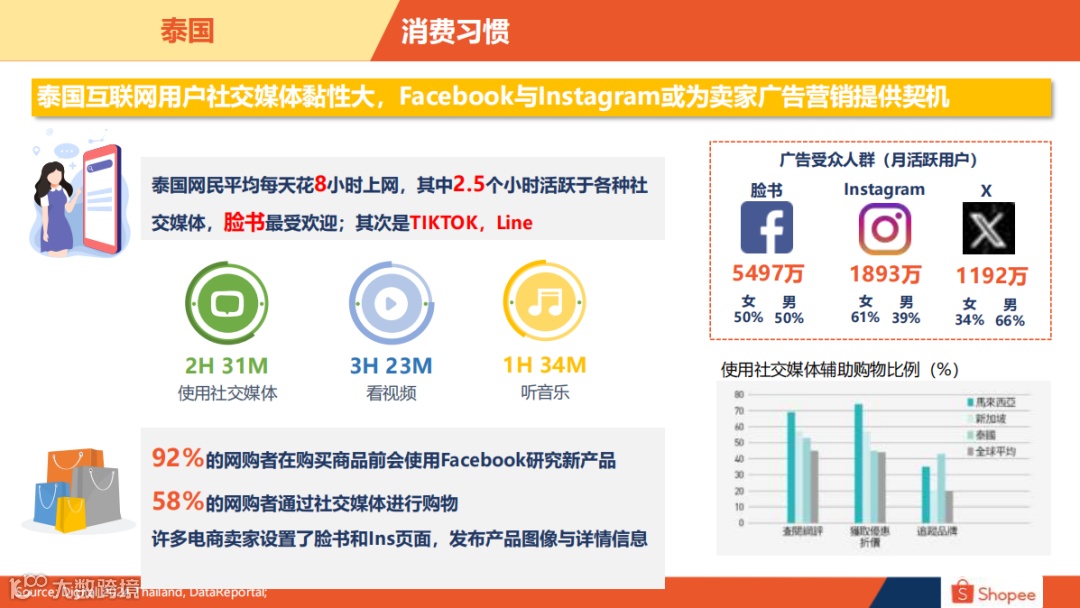 泰国网民平均每天花8小时上网,其中2.5个小时活跃于各种社交媒体,脸书最受欢迎,其次是TIKTOK,Line,而且Shopee在泰国广受欢迎,综合访问量与App下载量均位列22Q1第一。