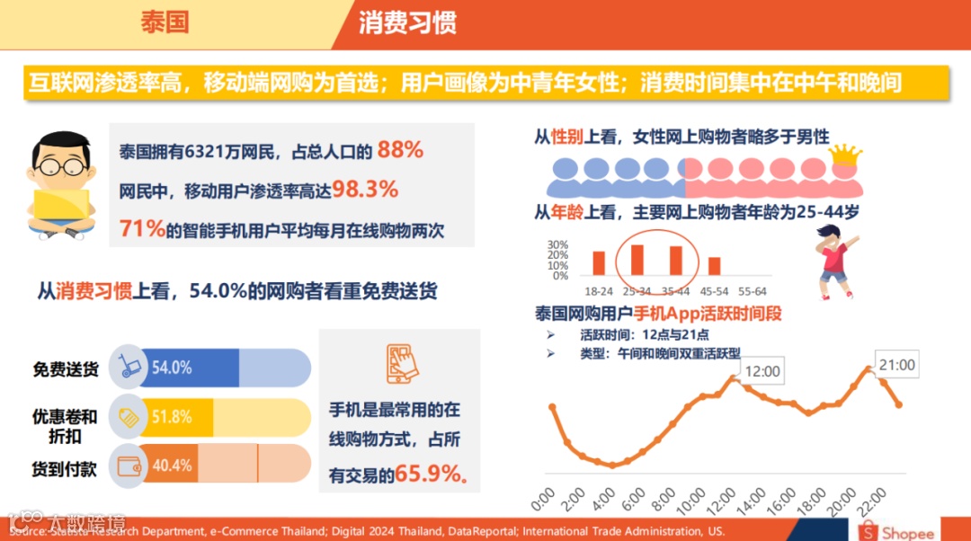 泰国拥有6321万网民,占总人口的 88% ,在网民中,移动用户渗透率高达98.3% ,其中71%的智能手机用户平均每月在线购物两次。