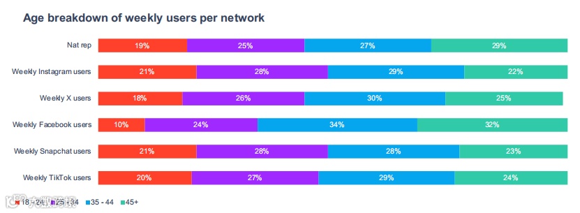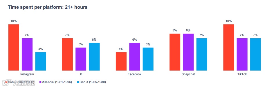 其中,Z世代最有可能每周花在Instagram和TikTok上的时间超过21小时,千禧一代最有可能每周花在Snapchat上的时间超过21小时。