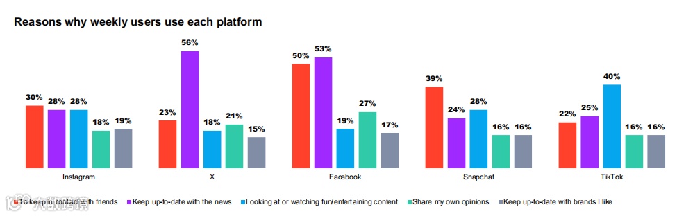 在使用目的方面,56%的X用户使用该平台来了解最新的新闻,50%的Facebook用户使用该平台与朋友保持联系,40%的TikTok用户观看有趣的内容。同时,15-19%的沙特用户会通过社交媒体去不断更新喜欢品牌。