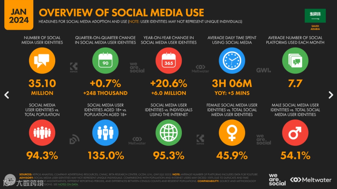 市场研究机构DataReportal的数据显示,截至2024年1月,沙特活跃的社交媒体用户数量为3510万,相当于总人口的94.3%,平均每人拥有7.7个社交媒体账户,平均每天使用社交媒体的时间超过3小时。
