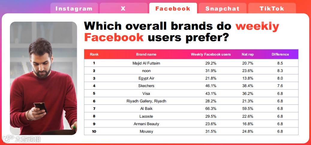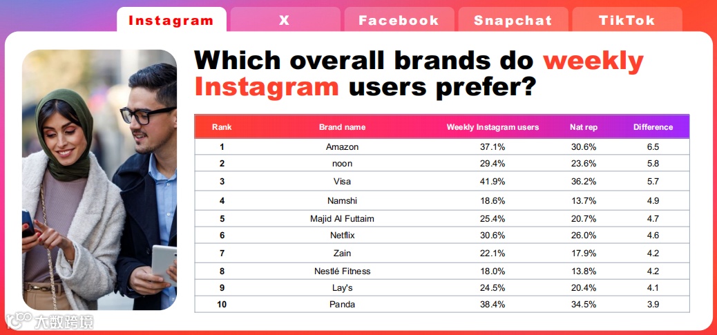 综合五个平台数据来看,沙特社交媒体用户对亚马逊和noon的偏好都比普通人群更强。说明社交媒体已经成为品牌与消费者互动的重要平台以及品牌提升销量的关键。