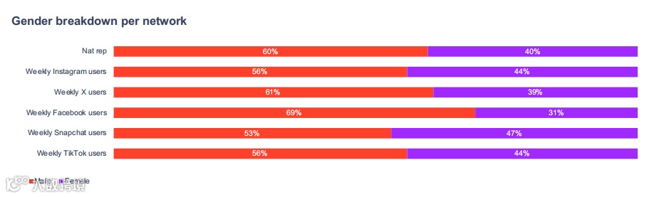 在用户性别方面,与其他社交网站相比,Facebook每周的用户更有可能是男性。而每周使用Snapchat、TikTok和Instagram的用户更有可能是女性。