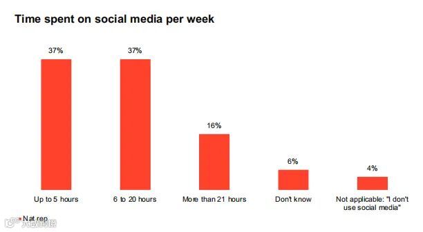 在使用时间方面,37%的沙特人每周在社交媒体上花费时间长达5小时,同样有37%的人会每周花费6-20个小时,而16%则花费超过21小时。