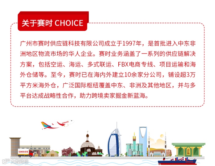 赛时自1997年成立,深耕中东专线,为中国出海企业提供多元化的跨境物流解决方案,包括国际空运、国际海运、FBA/FBN专线、海外仓等。赛时拥有深厚的物流渠道资源,研发高效的订单系统和仓储管理系统,为跨境卖家打造专业的物流服务团队。