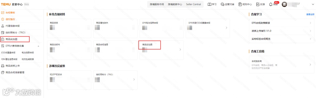 在【合规中心】页面,导航至【商品实拍图】模块并点击进入。