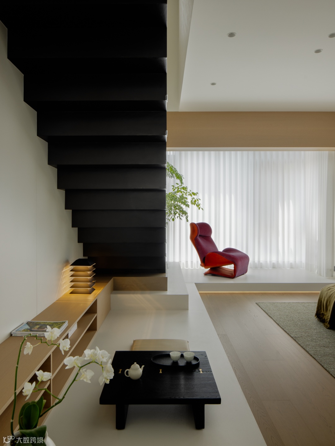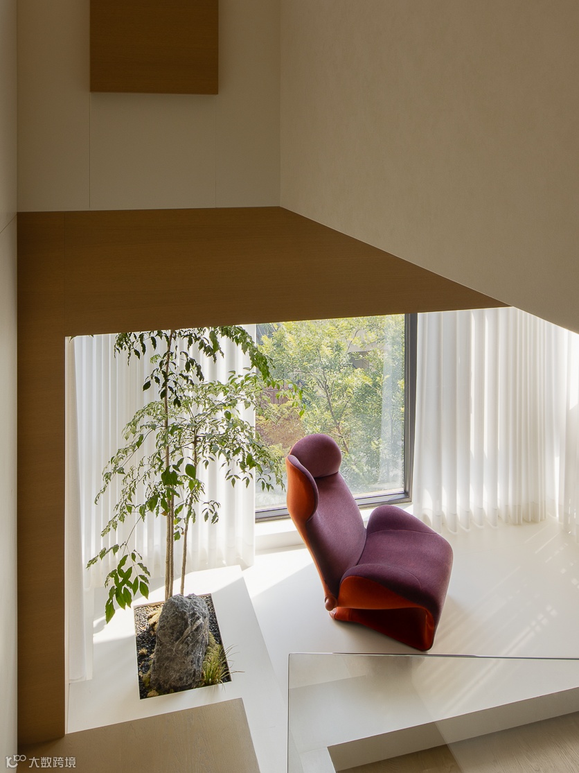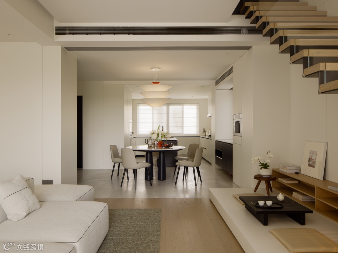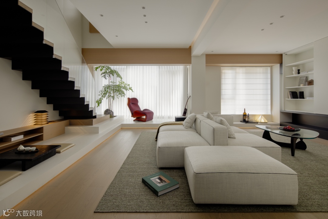 基于对生活场景的理性构思,设计将楼梯进行改位内置通过台阶进行抬高,与客厅形成落差感,制造区域的隐性划分。