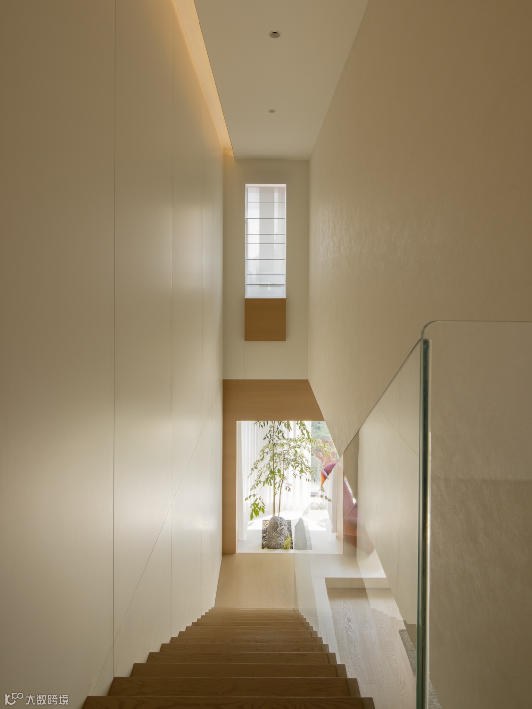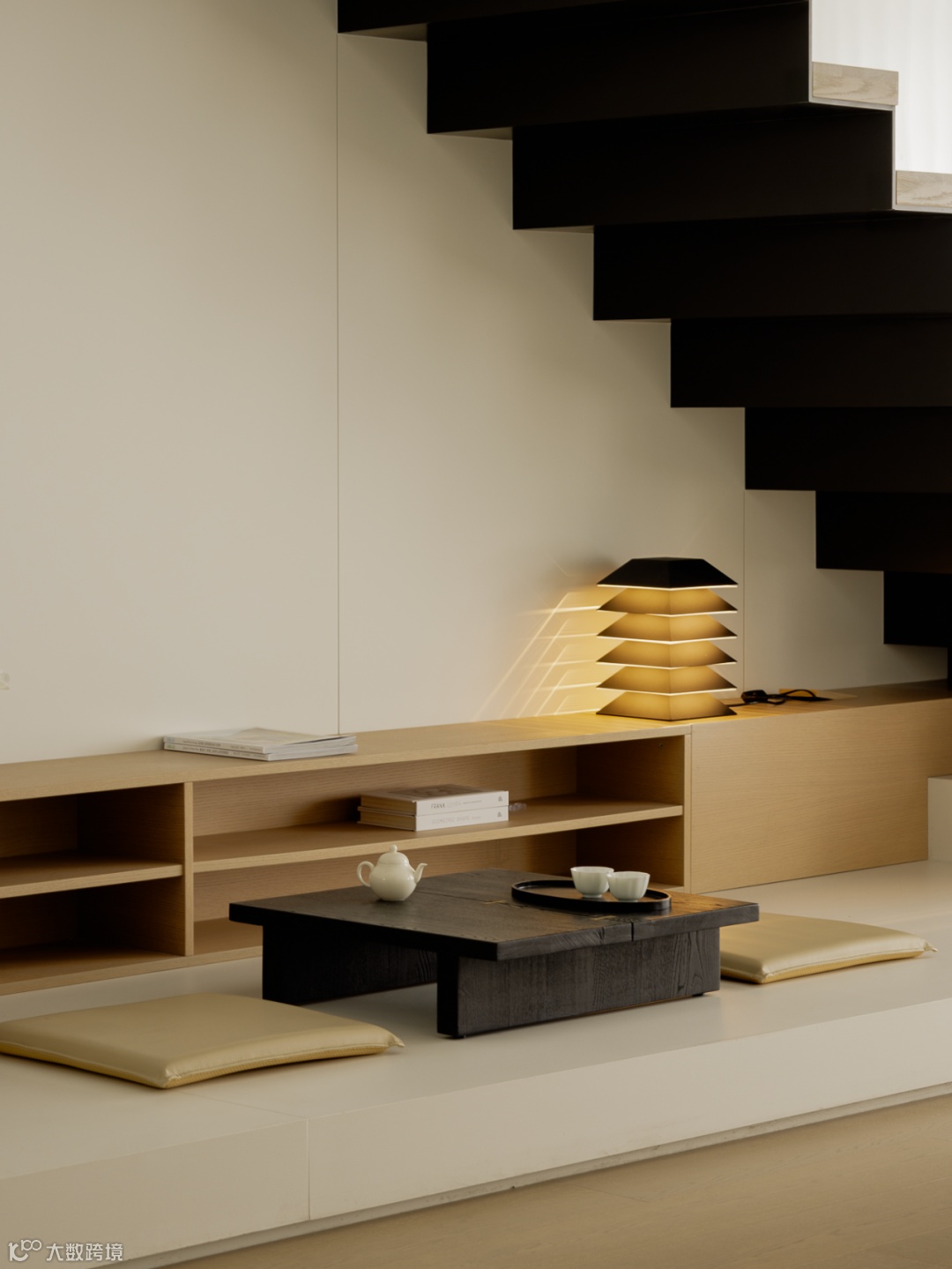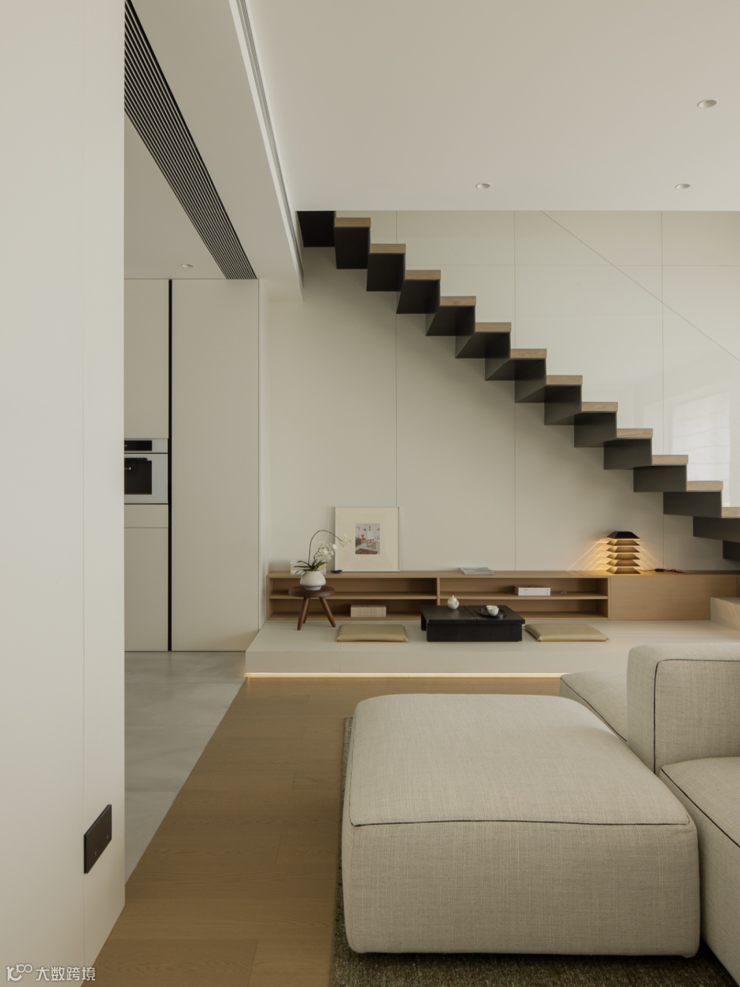 基于对生活场景的理性构思,设计将楼梯进行改位内置通过台阶进行抬高,与客厅形成落差感,制造区域的隐性划分。