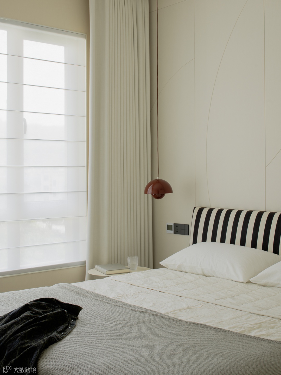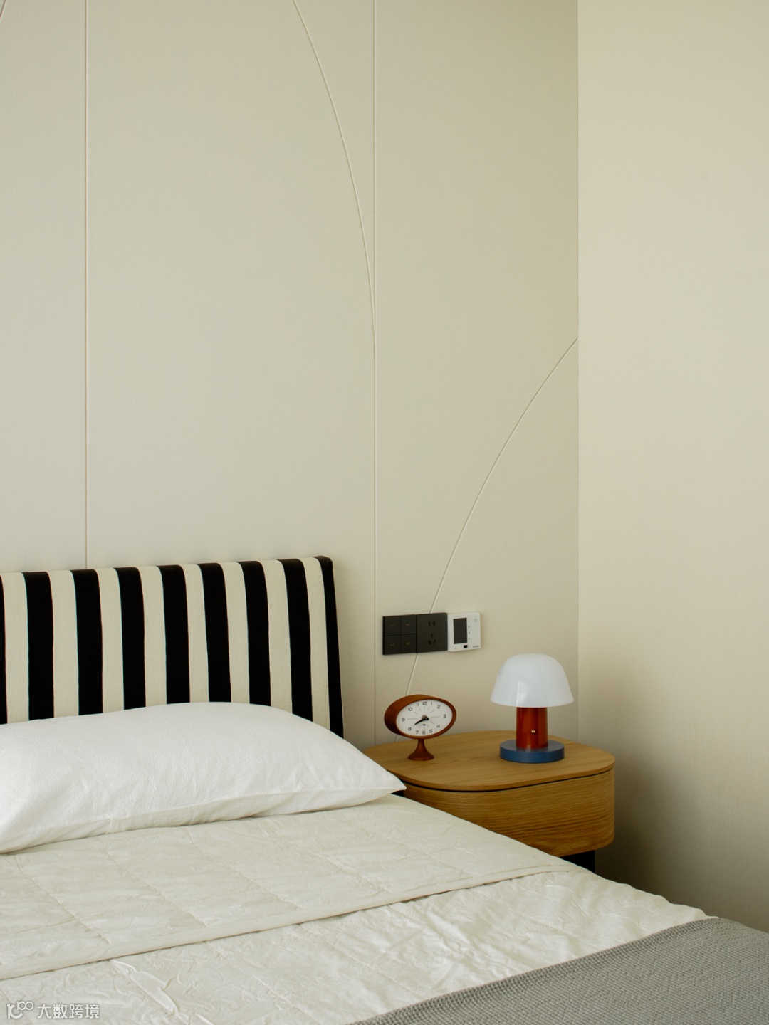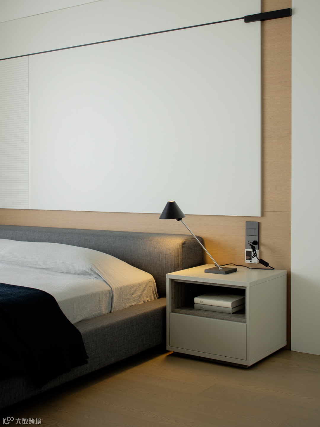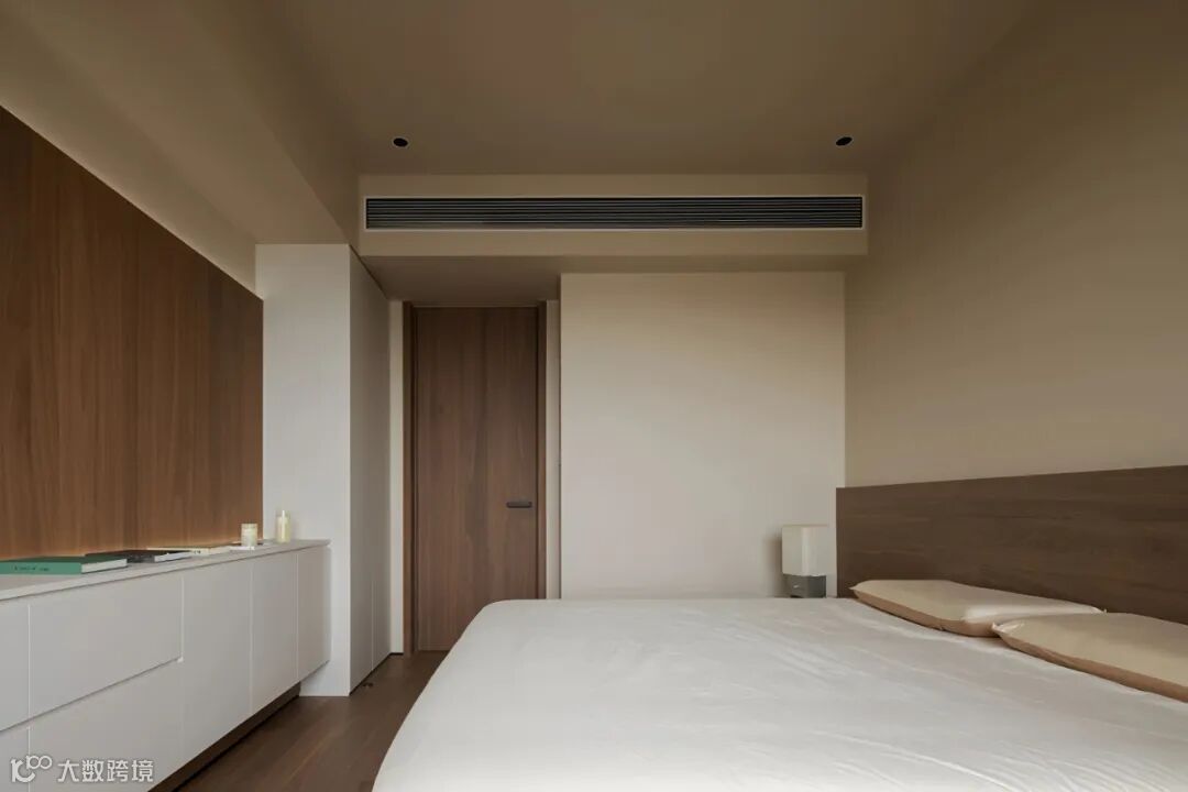 主卧套房铺展温润简约的框架,根据业主的日常习惯与使用动线,调度入寝、洗漱、更衣动线,优化宽阔舒适的收纳布局,展现品质格调。床头背景墙以线条和体块切割出流畅的黄金比例,不同材质、肌理互相拼接,与侧边的柜面呼应,丰富空间趣味。