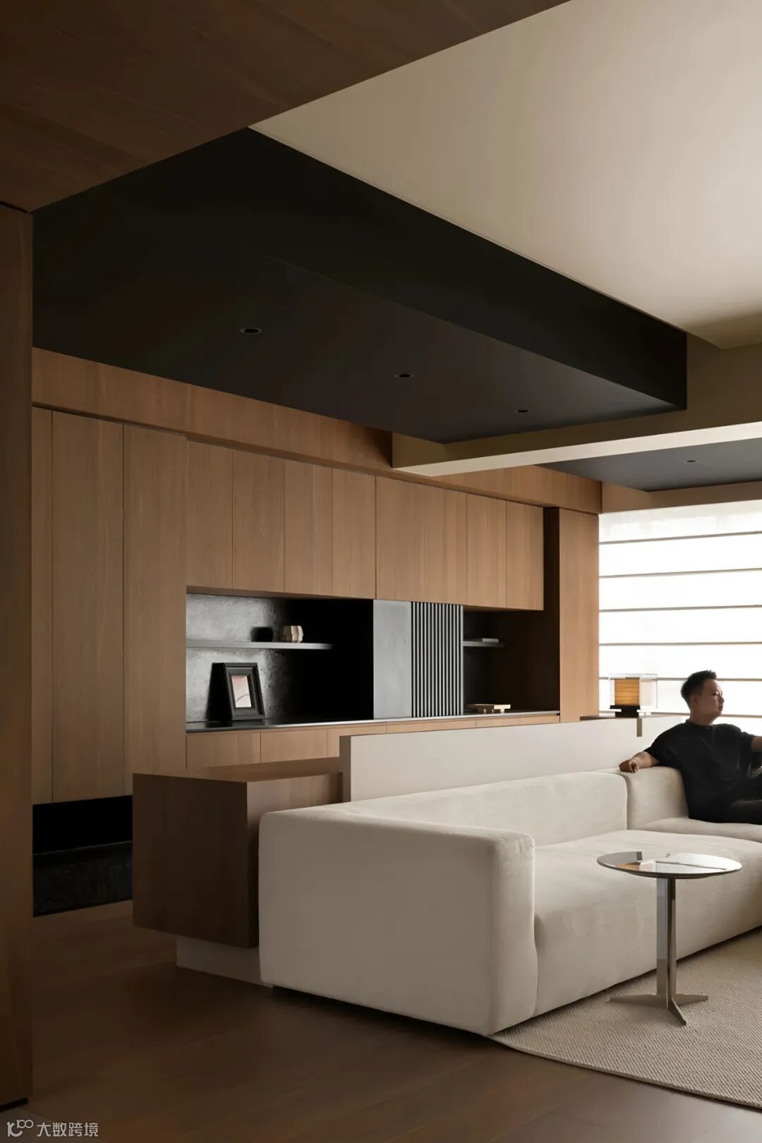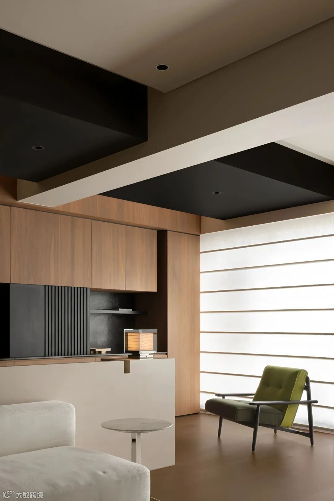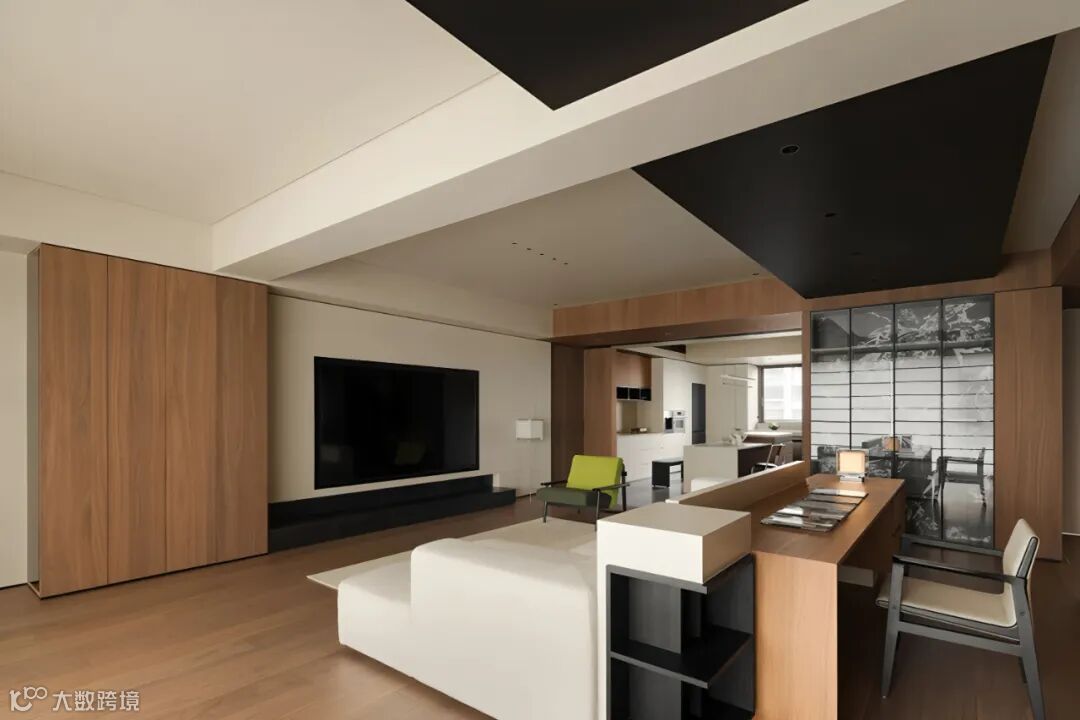 岛台外部围合黑色格栅,白色台面穿插木结构体,作为料理、简餐的互动区,增加家庭交流的亲密感。