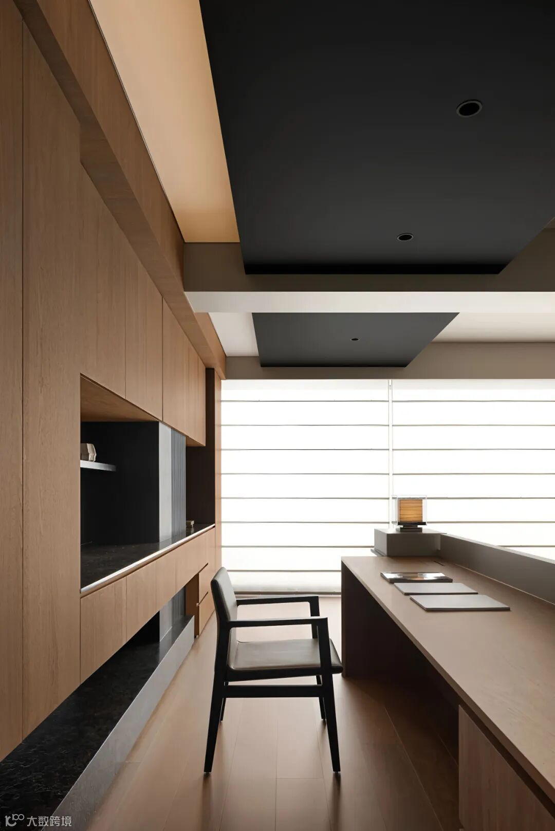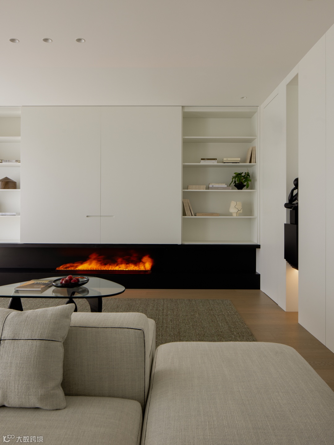 黑白分割体块,统筹零碎区域,协调整个公共区整洁有序。幽黑质感的背景下,温暖的炉火缓缓滋生温度,加深了空间饱和度,凝聚出家的温馨实感。