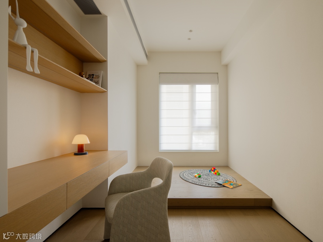 儿童房定制榻榻米和书桌,尺寸比例得到舒适的嵌合,布局和收纳皆考虑未来孩子的需求,营造安全舒适的居住体验,打造专属的成长世界。