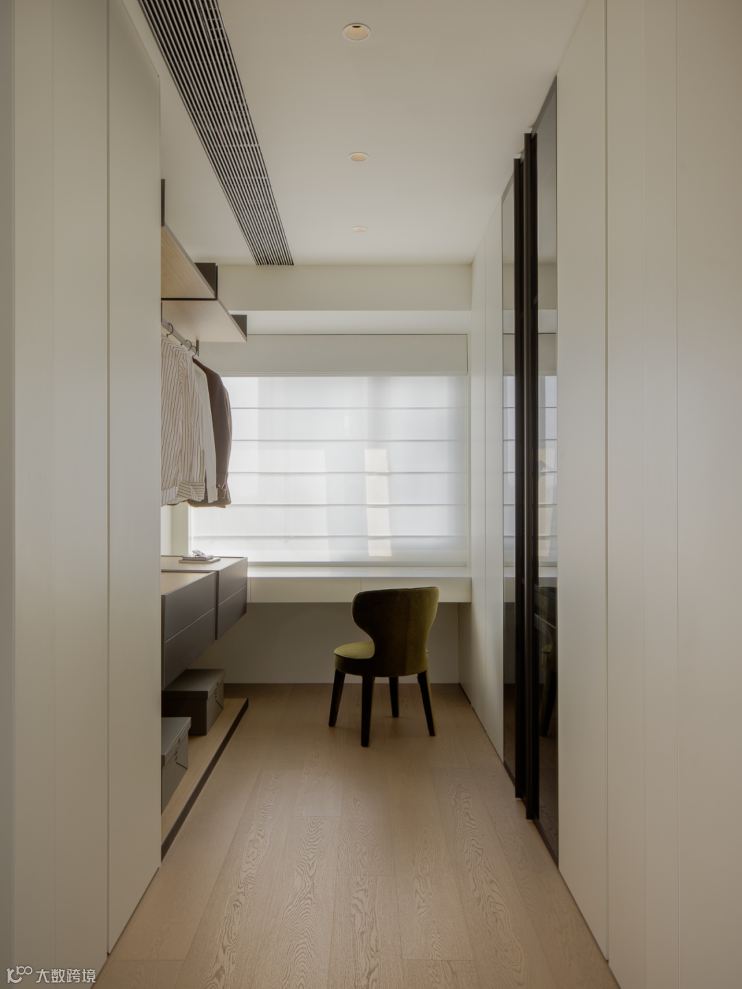 独立衣帽间升级更高效的收纳体系,同时增设开放式的次净衣区,根据衣物品类、季节进行更精细化的布局。柜门与玻璃门互相搭配,打破单调和厚重感。双台盆卫浴符合业主的使用习惯,布局流畅舒宜的生活节奏。