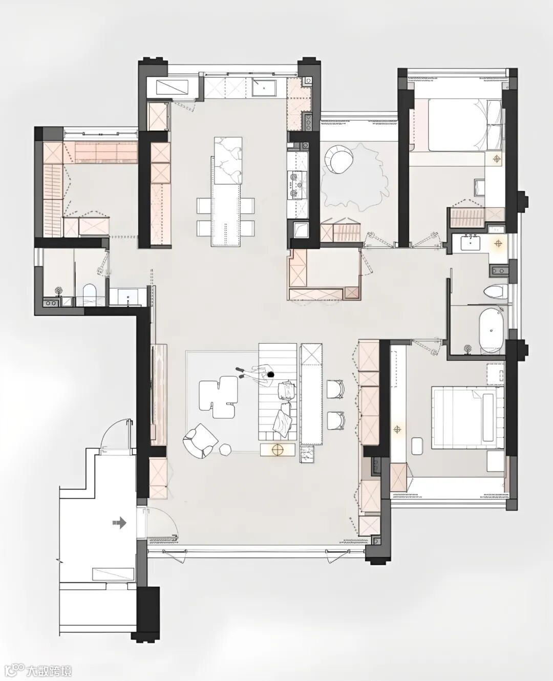 睡眠区重视当下和未来家庭成员的需求,以一条过道串联三间卧室入口,增加空间利用率,在理性的布局中流露着对内心情绪的关照。