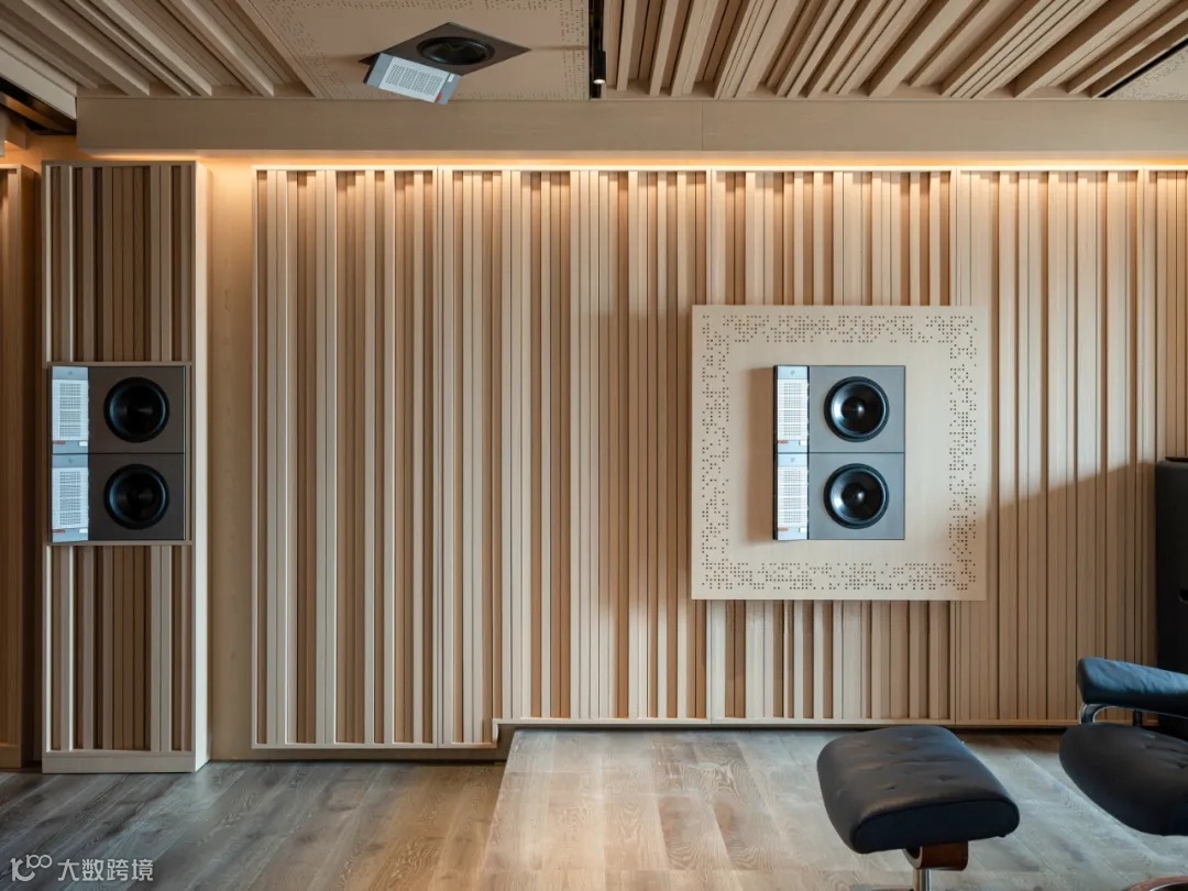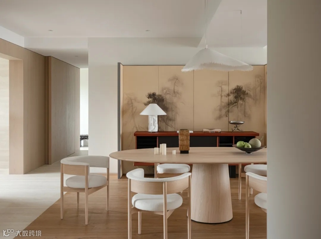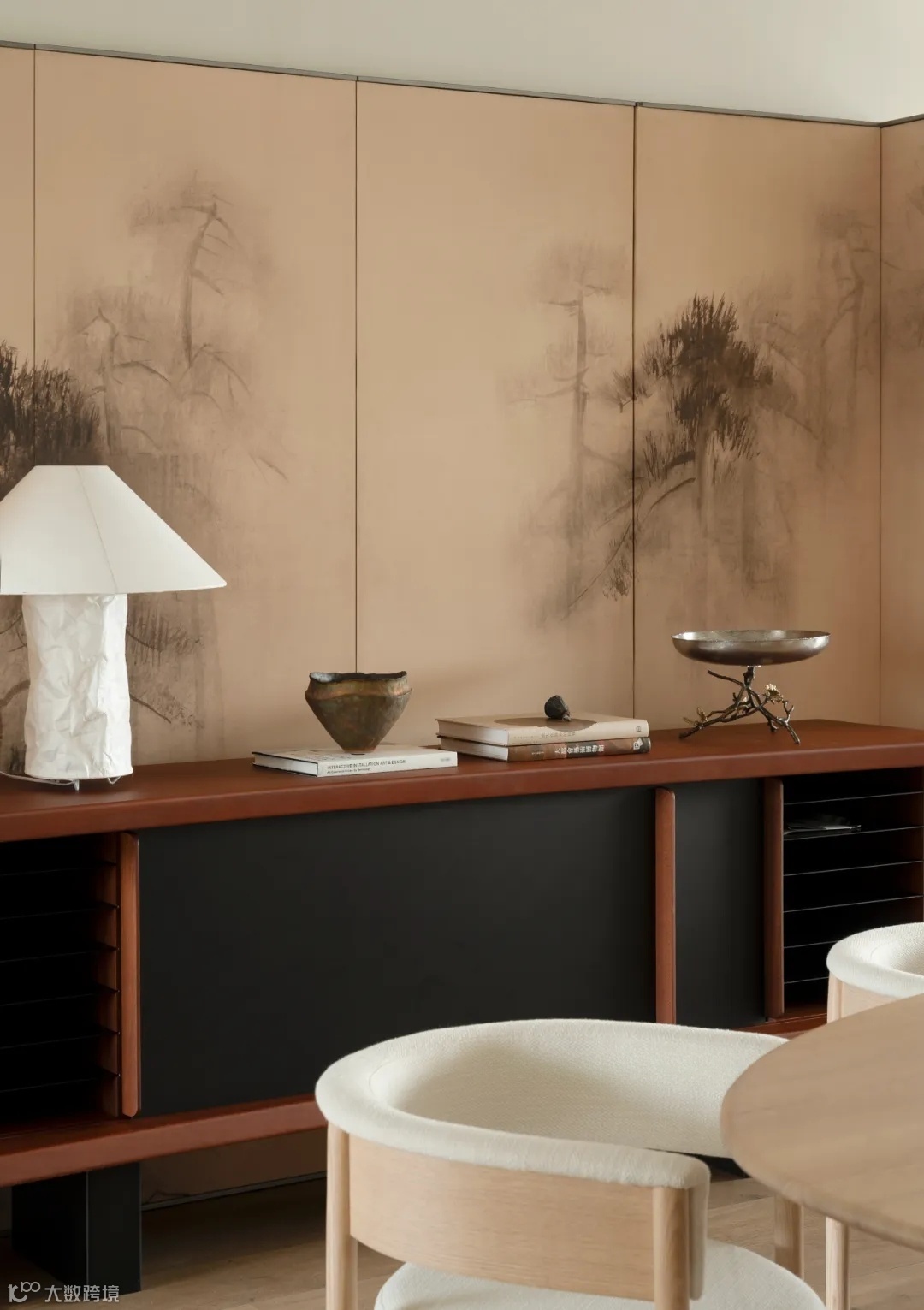 这是一处给父母打造的东方意蕴和容纳主人家试听圣殿的复式宅邸。设计上融入中式元素,但不追求传统中式的厚重,而是让东方感以更轻松的姿态出现,雅致、克制,也更贴近日常的呼吸。浅色墙面+低饱和度的软装、带有东方意味的灯具和器物,彼此间构成了一个“让人心安”的场域。一幅水墨屏风落在空间里,像是山水留白,给客餐厅添上点睛的一笔——不喧闹,却足够有力量。