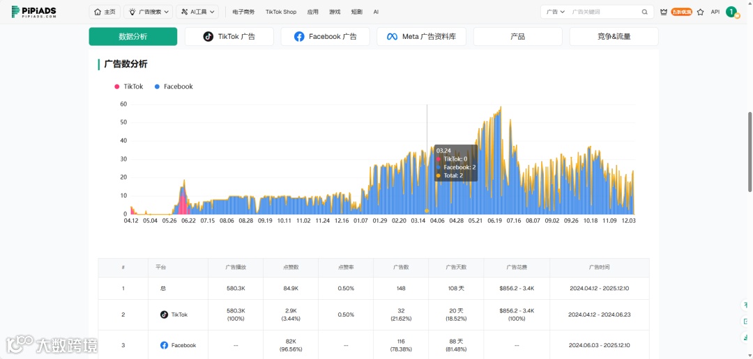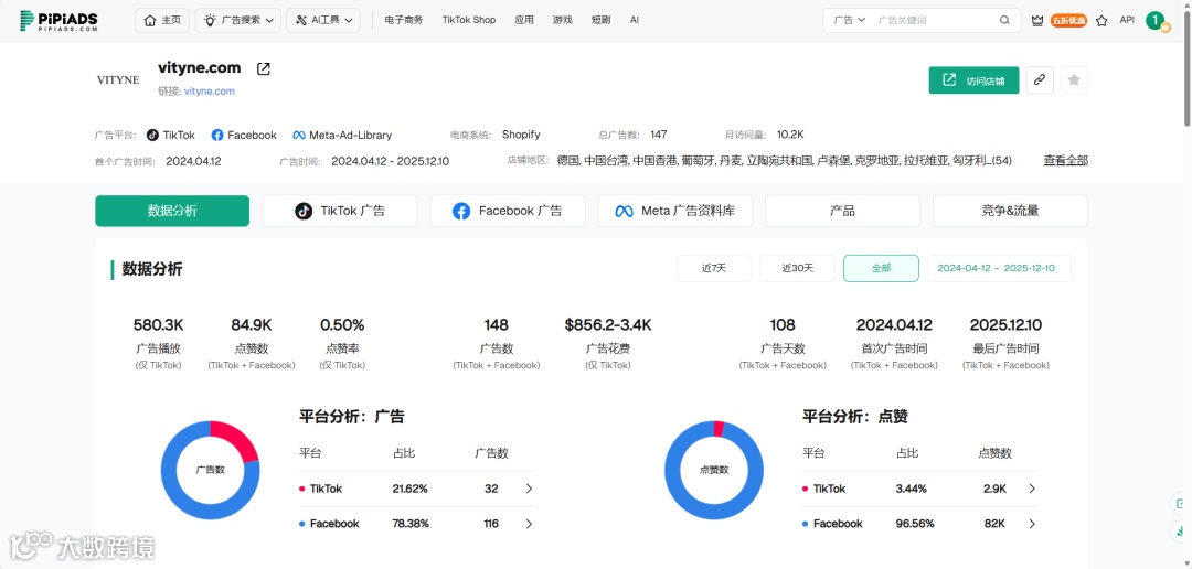 品牌广告主Vityne通过608天持续投放,在Facebook构建竞争优势。PiPiADS数据显示,其互动占比高达96.56%,远超TikTok等平台。