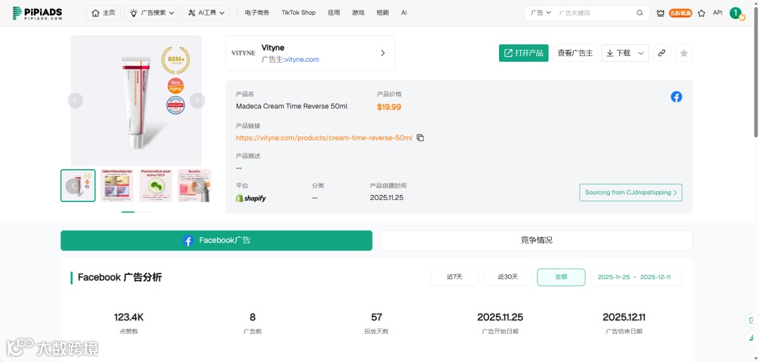 根据PiPiADS平台数据,Centellian24在2025年11月25日至12月11日进行了为期18天的连续广告投放,精准把握欧美市场节奏。