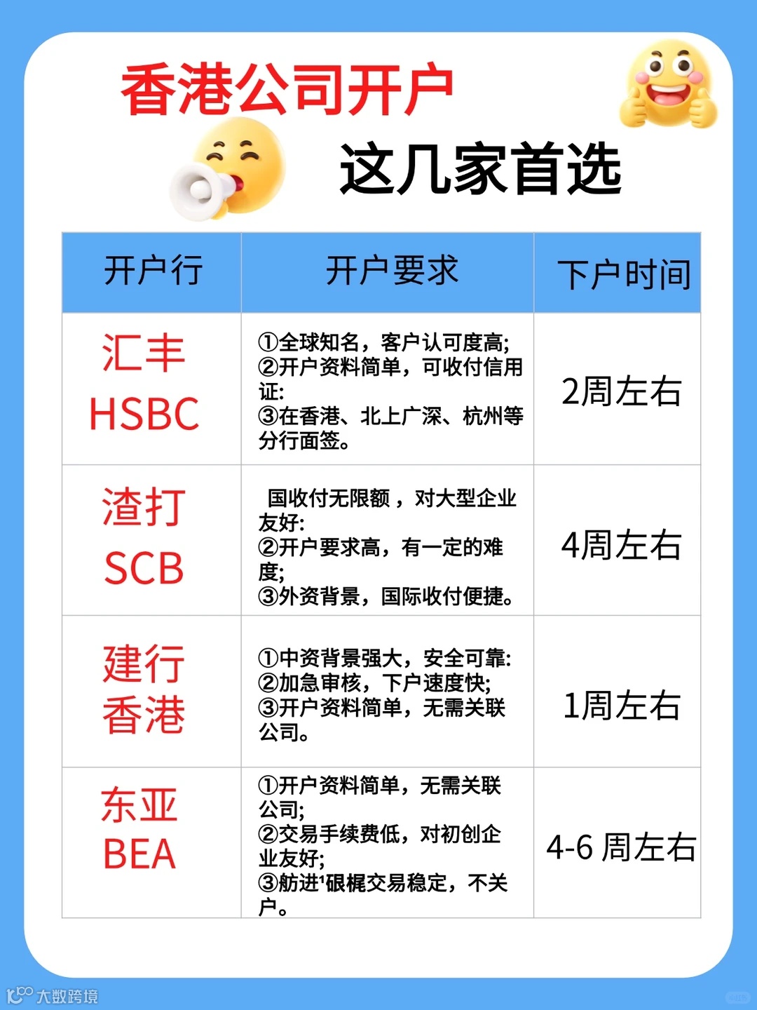 大型跨国企业:汇丰银行、渣打银行等国际银行,具有全球网络优势,能提供便捷的国际结算服务。 -