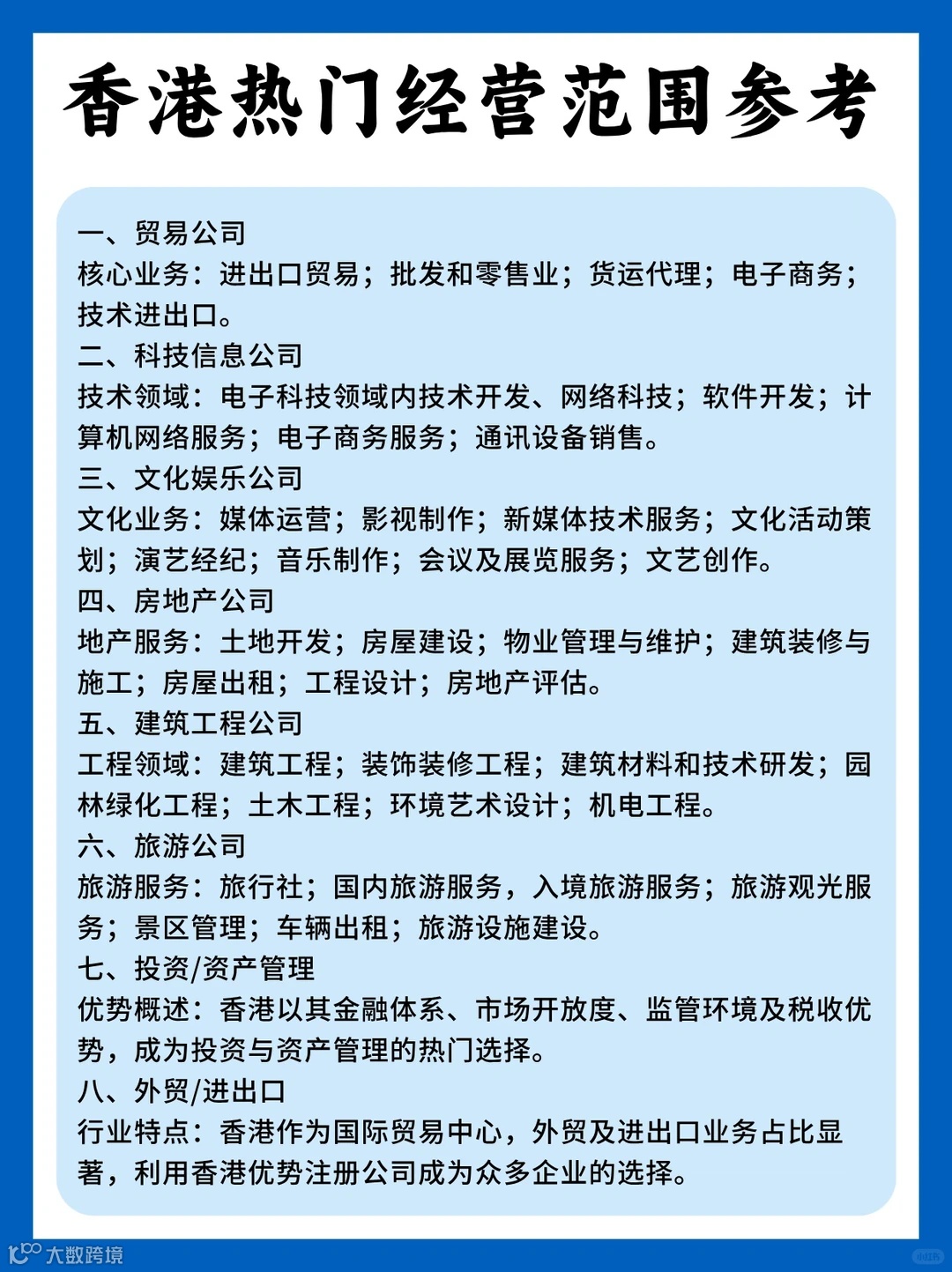 香港对公司经营范围限制极少,100字内基本自由表述。