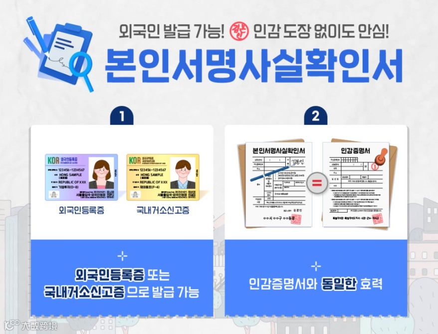 집 또는 차량을 구입할 때혹은 은행 업무를 볼 때인감도장이 필요하다고들어보신 적 있으시죠? 이제는 인감도장 없이[본인서명사실확인서]한 장이면 충분합니다 특히 외국인도 발급이가능해서 복잡한 도장 등록절차 없이 간단히 신분을증명할 수 있습니다 ✅ 본인서명사실확인서란?도장을 대신해 본인의 서명으로신분을 증명하는 공식 문서입니다예전에는 인감도장이 필수였지만지금은 전자 서명만으로도동일한 법적 효력을 가집니다 ✅ 발급 가능 대상:외국인등록증 소지한 외국인인감증명서와 동일한 효력을인정받으며 도장이 없어도각종 계약이나 행정 업무에사용할 수 있습니다 발급 방법:1️⃣ 시청,구청,동사무소방문하여 신청2️⃣ 외국인 등록증 제출3️⃣ 전자패드에 서명하면바로 발급 완료발급 수수료: 600원(인감증명서와 동일) 주요 사용처:부동산 매매·전·월세 계약 시자동차 매매·명의 이전 등록 시은행·보험 등 금융기관 거래 시위임장·동의서 등 법적 효력이필요한 문서 제출 시 ⚠️ 유의사항반드시 본인이 직접방문하여 서명해야 하며대리 발급은 불가능합니다