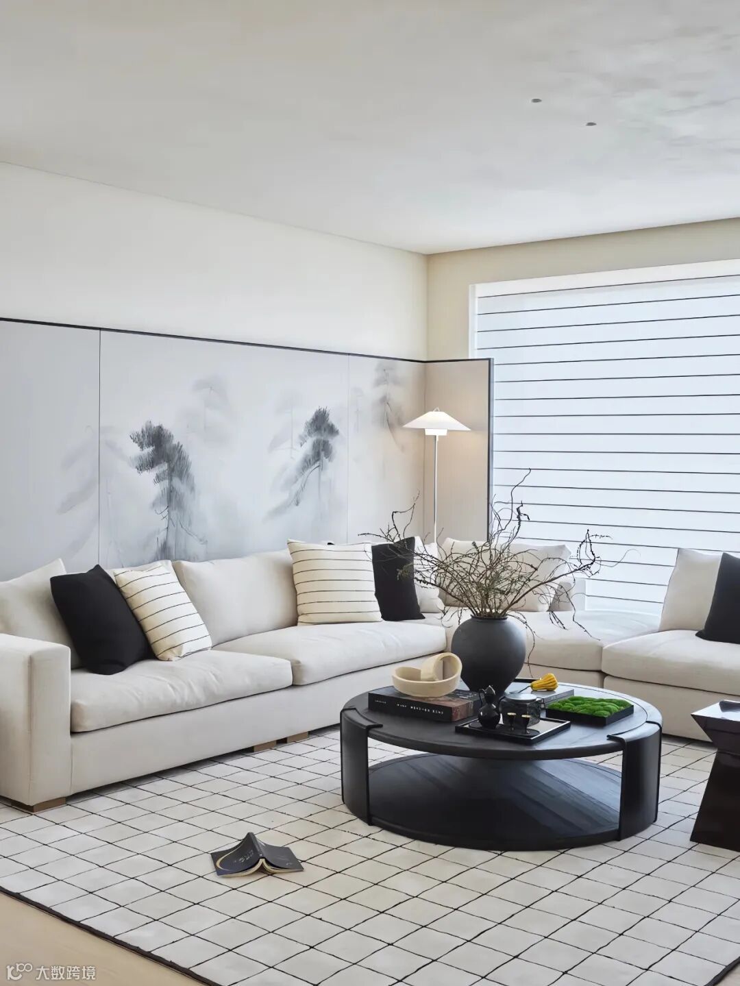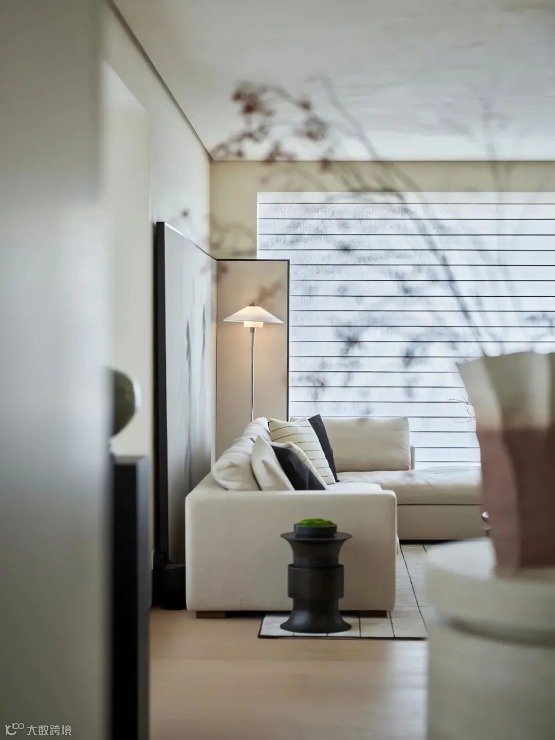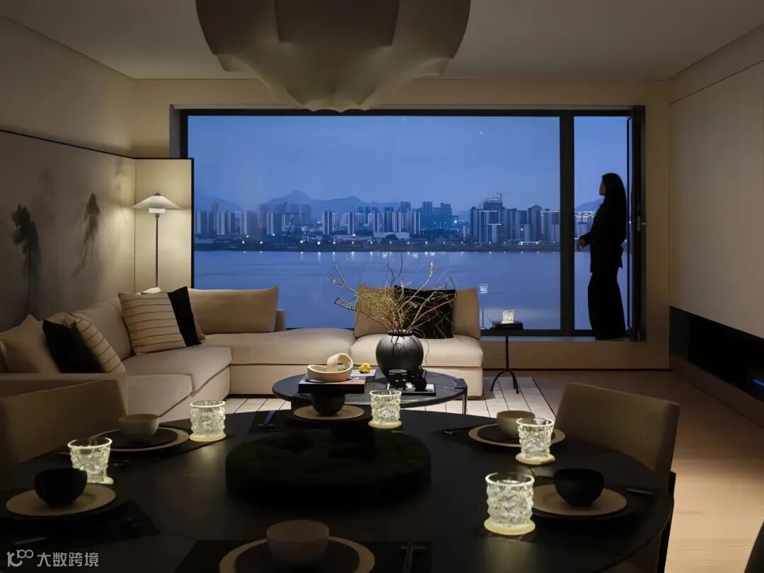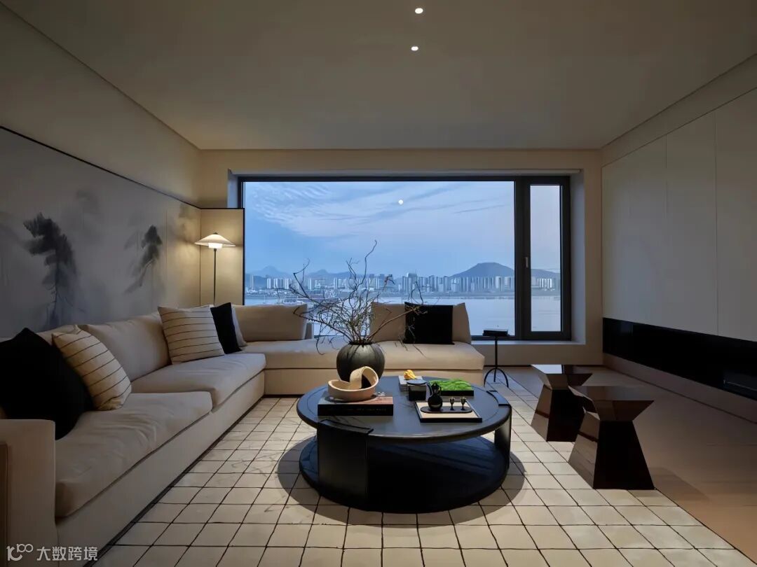 落地灯的暖光顺着沙发漫开,嵌入式灯勾出墙面的轮廓;夜晚江景灯火亮起时,室内的光与江面的光碰在一起,连影子都裹着静奢的软。浅暖素墙像宣纸的底色,衬着背景墙的水墨松枝,把东方的 “空” 揉进极简里,让江景的流动成了空间的 “活墨”。