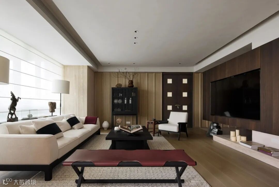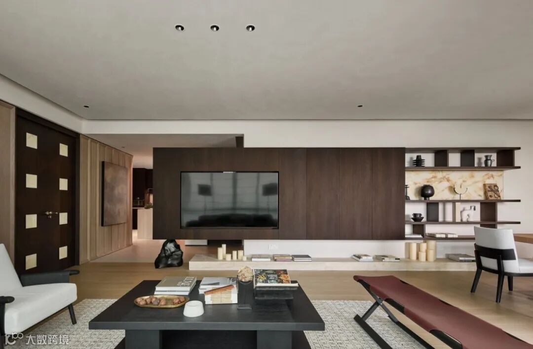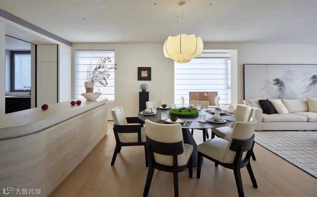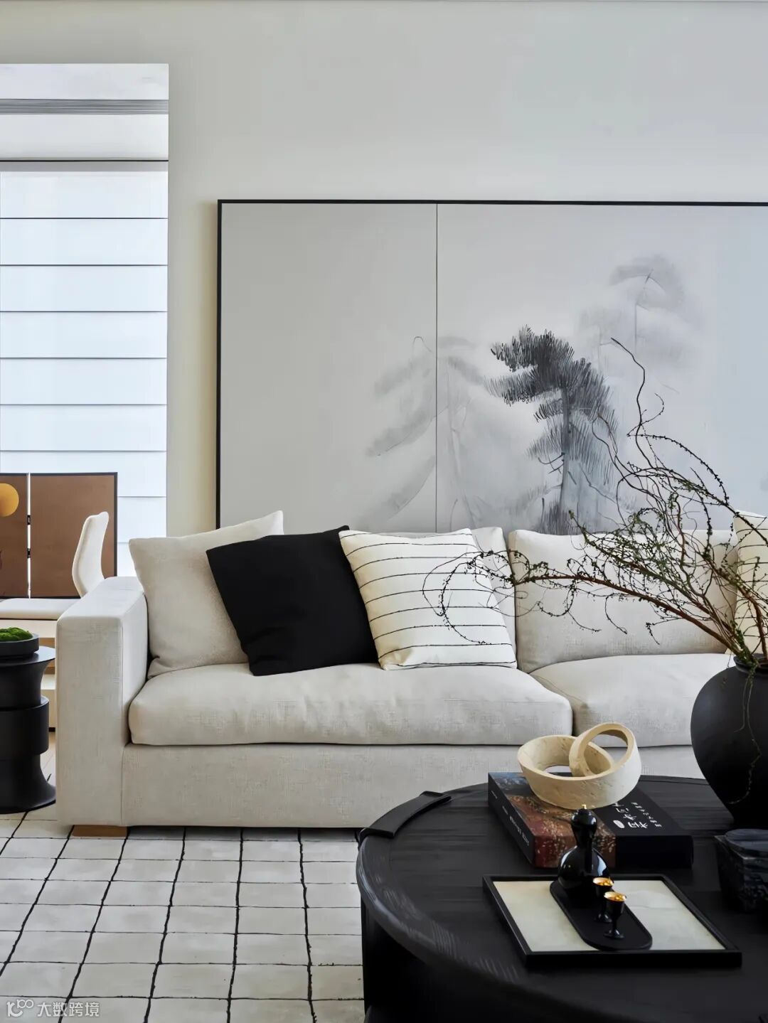 落地灯的暖光顺着沙发漫开,嵌入式灯勾出墙面的轮廓;夜晚江景灯火亮起时,室内的光与江面的光碰在一起,连影子都裹着静奢的软。浅暖素墙像宣纸的底色,衬着背景墙的水墨松枝,把东方的 “空” 揉进极简里,让江景的流动成了空间的 “活墨”。