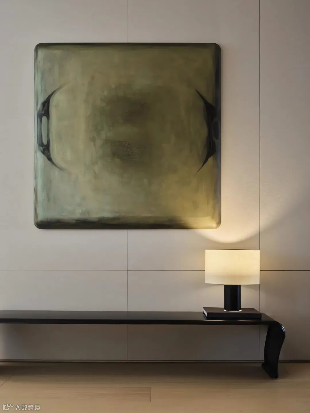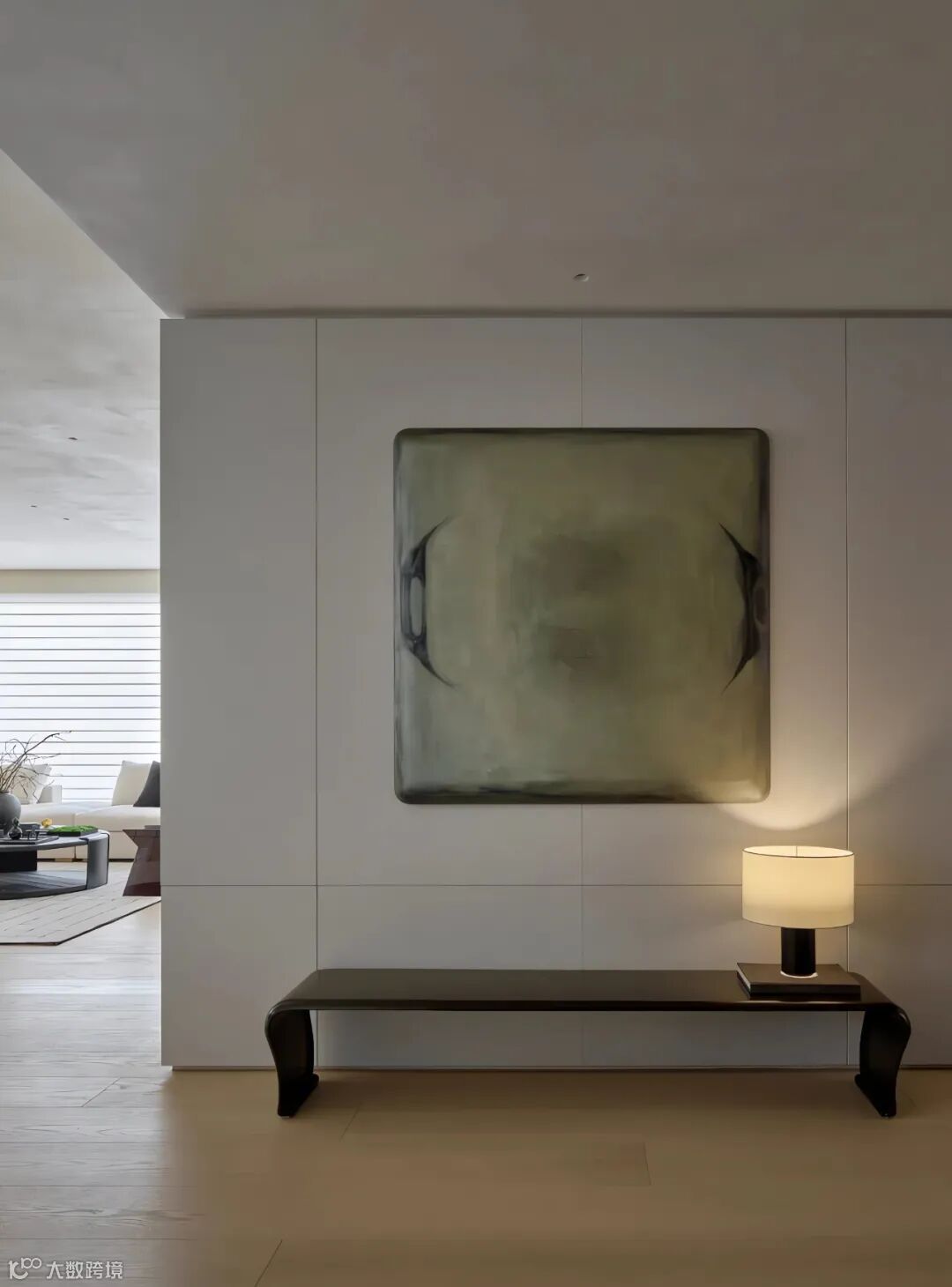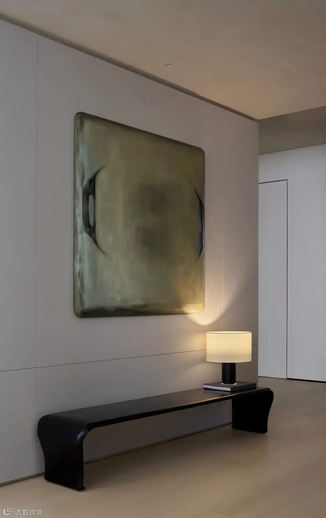 从留白的呼吸感,到光影的仪式感,再到艺术的精神意境,这方玄关践行着极简静奢的核心:它不追求表面夺目,而是让空间成为 精神的容器。目光聚焦于装置艺术画上物理性的动态与力量,光影在墙面折射出静谧的光斑时,真正的玄关,是「生活与美学的第一重共鸣」,是「心灵栖居的序章」。