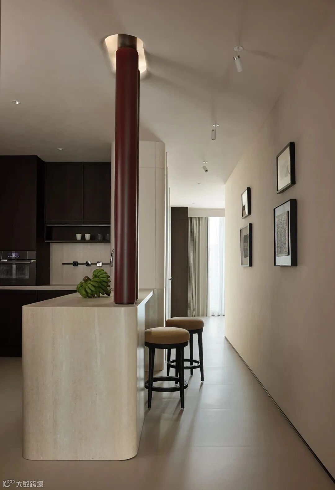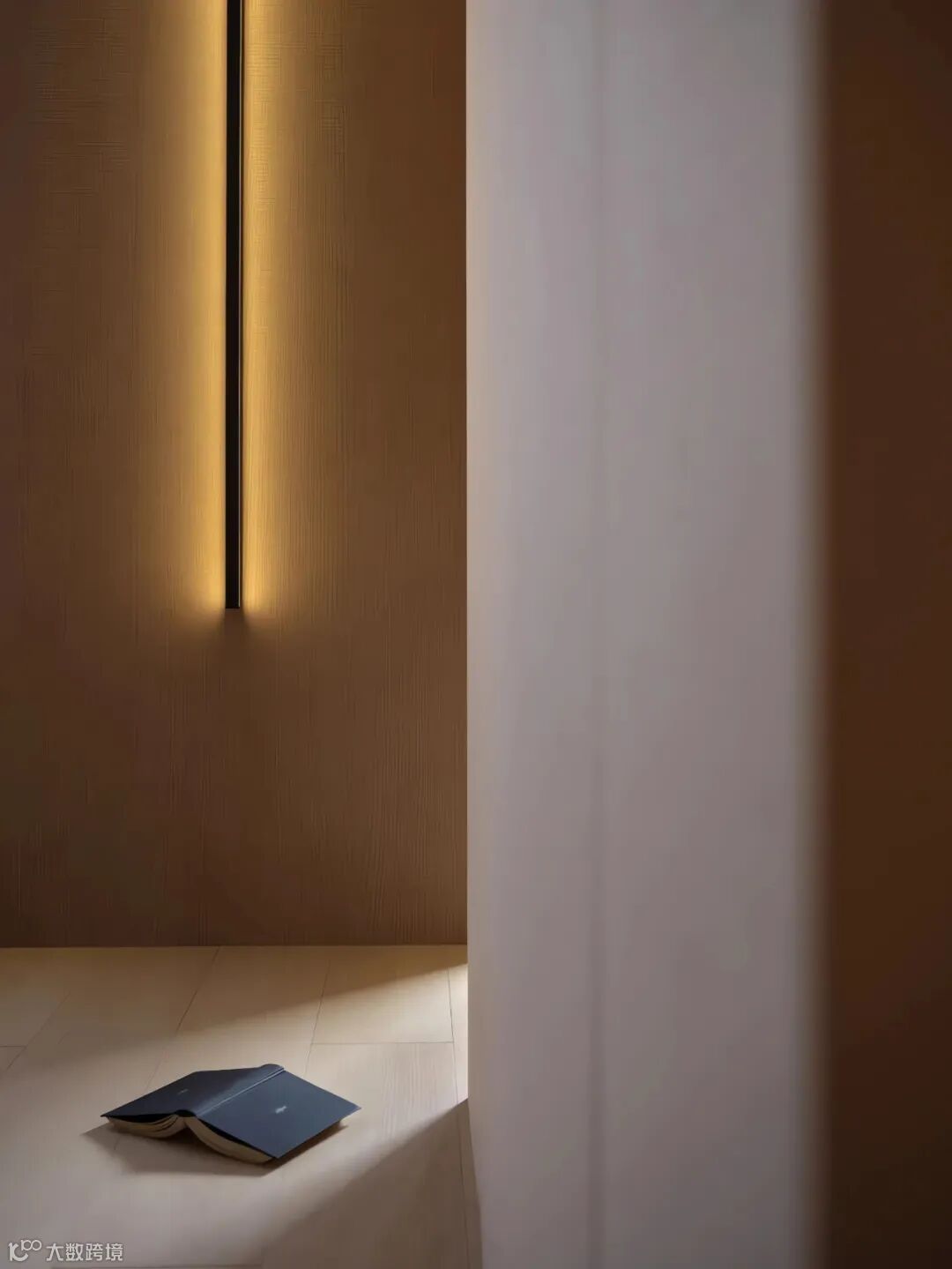 空间的呼吸分隔:黑细格栅半掩着书茶区,既没切断光的流动,又让书茶区的静与餐区的暖,隔着一道 “疏透的边界”,转场时的氛围切换,柔和得不着痕迹;光影的过渡带:壁灯的暖光顺着素墙漫开,与尽头书茶区的光连成一片,哪怕深夜走过,也像被一层软光裹着。