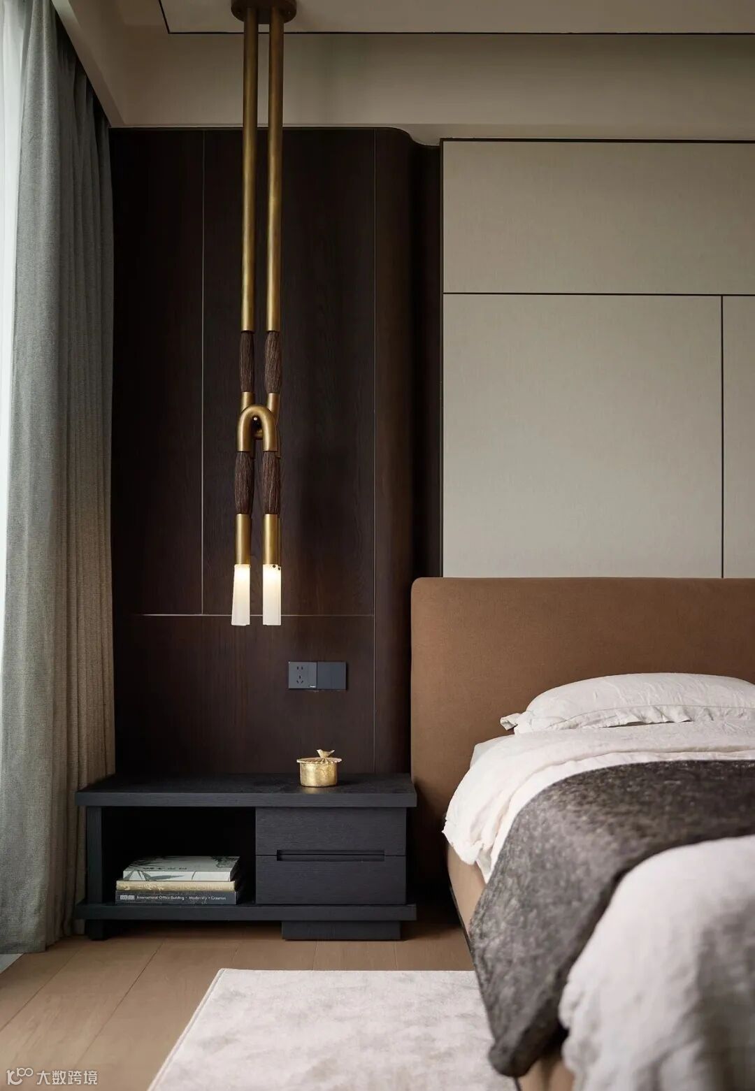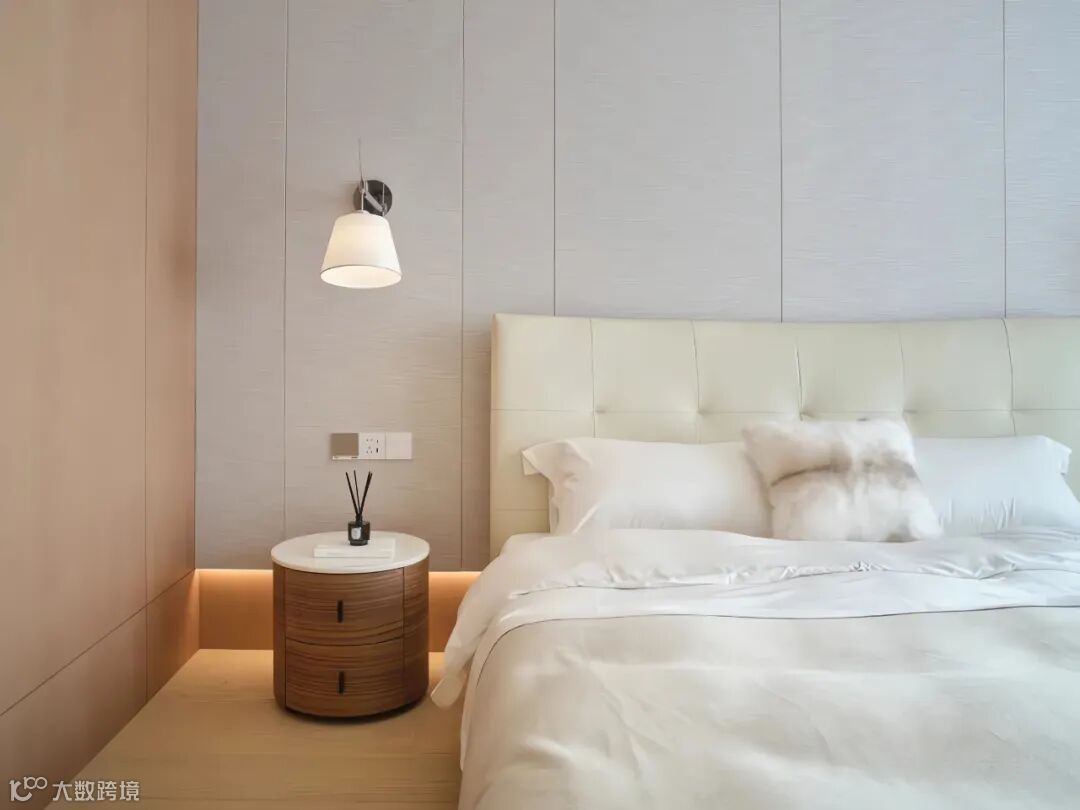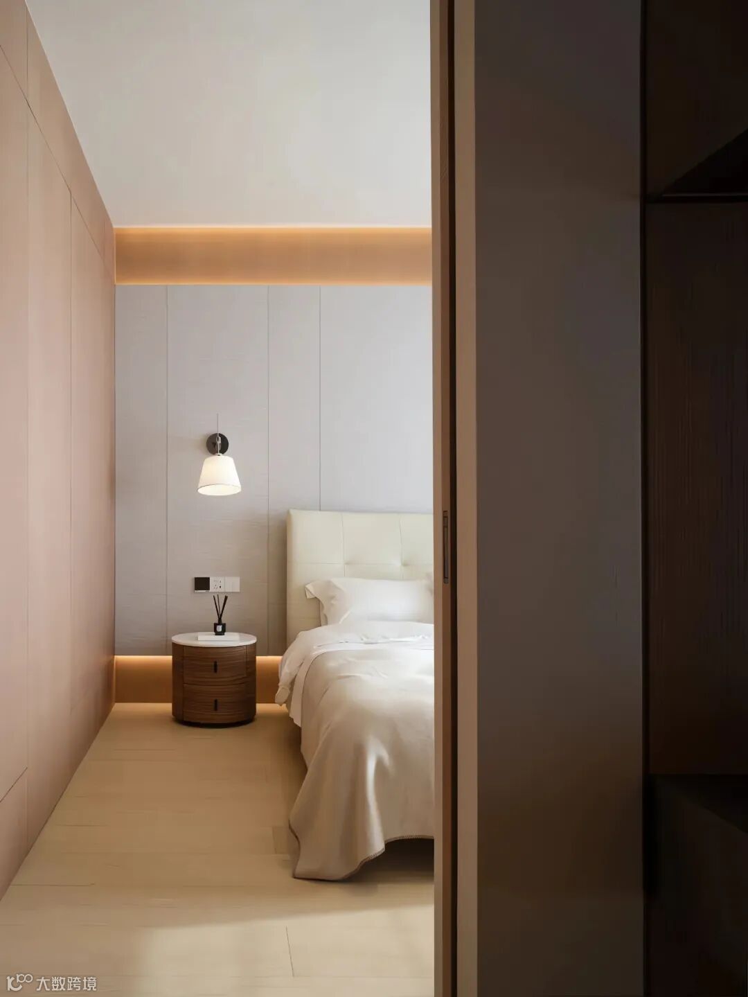 浅木的温软先裹住感官 —— 这方主卧没做繁复装饰,却把 “藏” 的巧思、“柔” 的质感,揉进了极简东方的静奢里:暗门藏起卫生间的烟火,灯光裹住休憩的松弛,软装落得恰好,每一处都是 “好看又好用” 的栖心处。