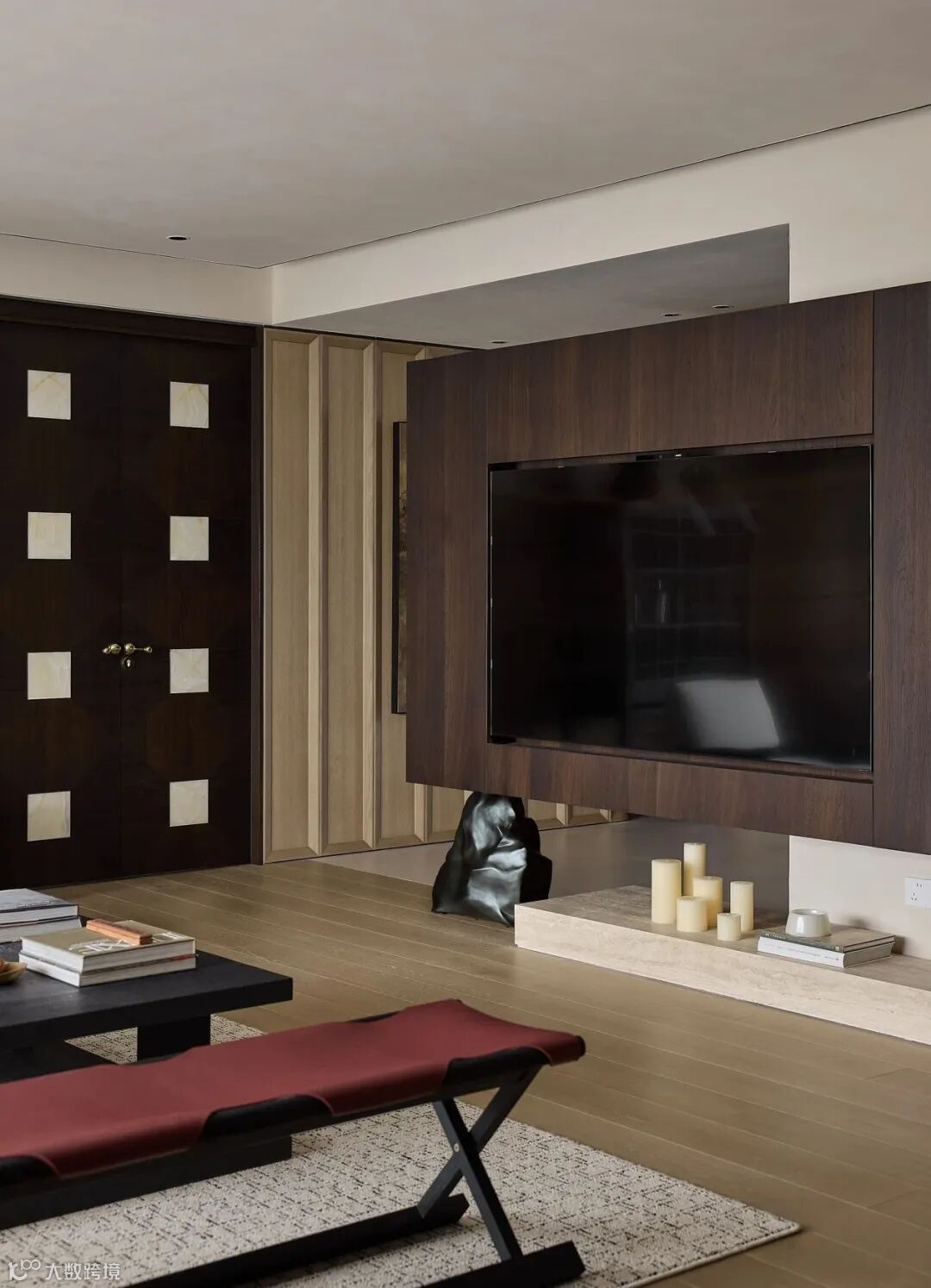 悬浮柜体暗合东方空间的“藏露之道”,缓缓将客厅景致半掩,既留存初见时的留白雅趣,又以木质肌理的温润触感,先承接住归家的松弛感。