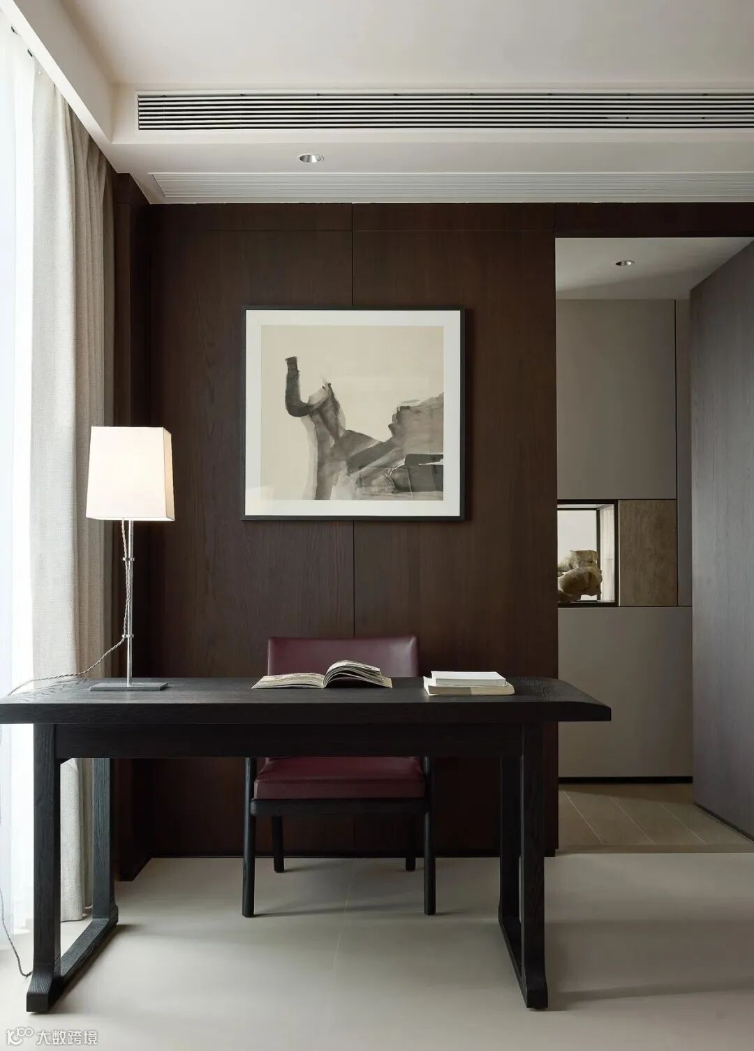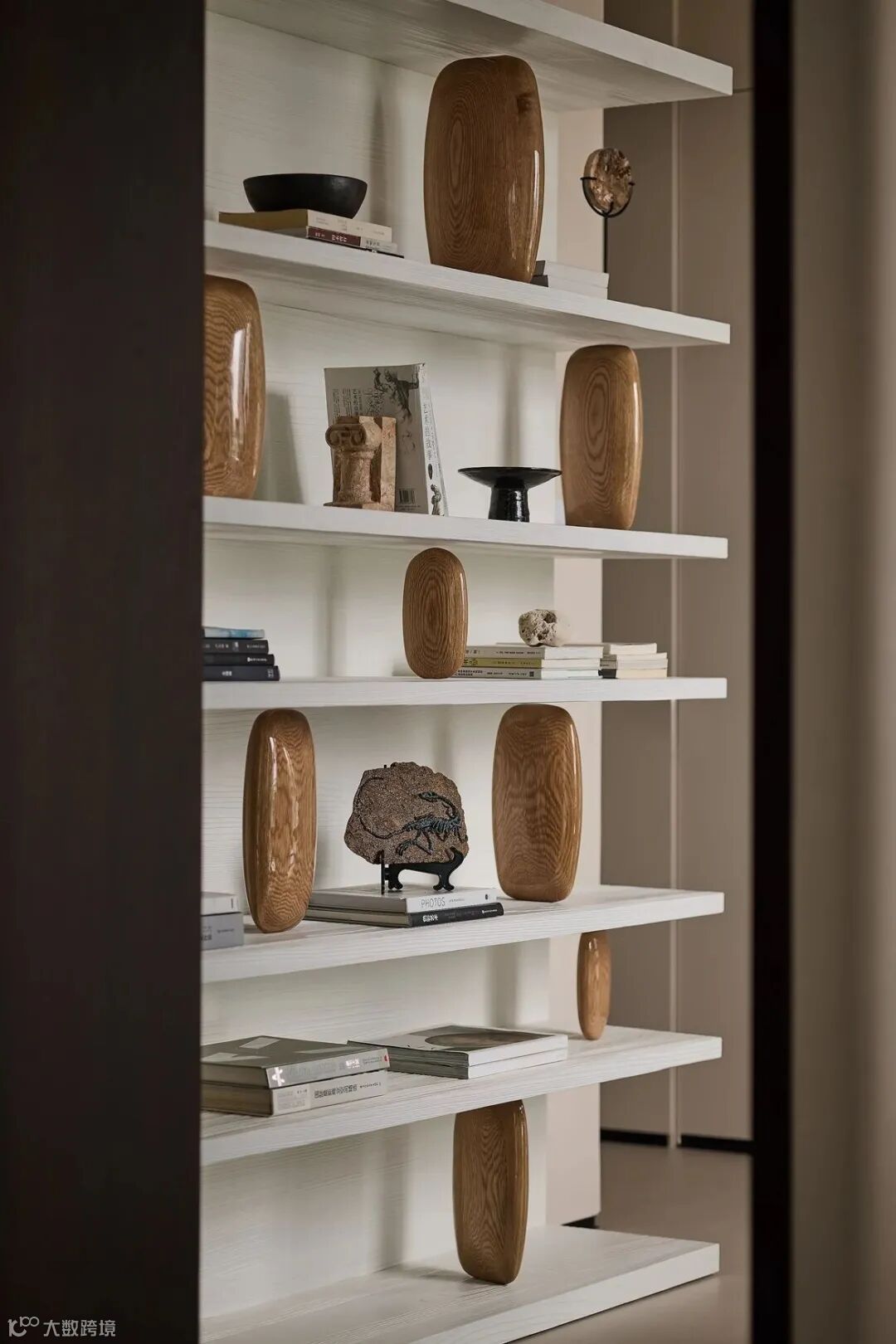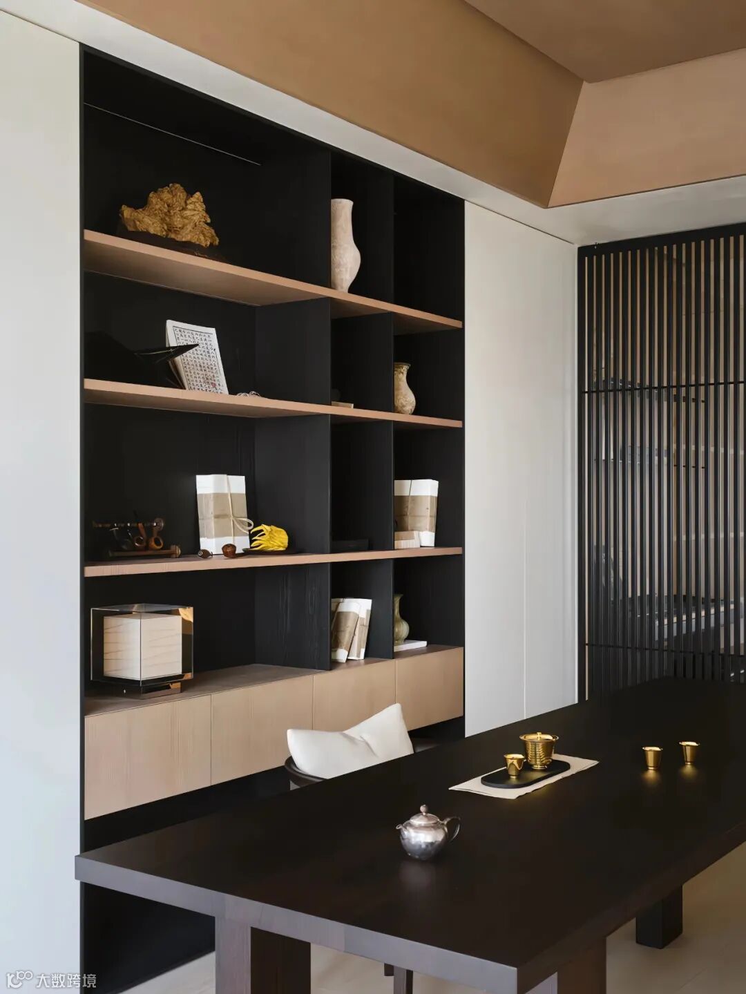 推开格栅的刹那,墨香与茶气先裹住了感官。只以极简东方的肌理,把读书的静、品茶的松弛,没有繁杂装饰,却用「克制的收纳美学」说话 —— 书与藏品各得其所,背景墙于是有了 “静奢的叙事感”,目光所及都是沉淀的质感;与人、茶、与自己好好相处。